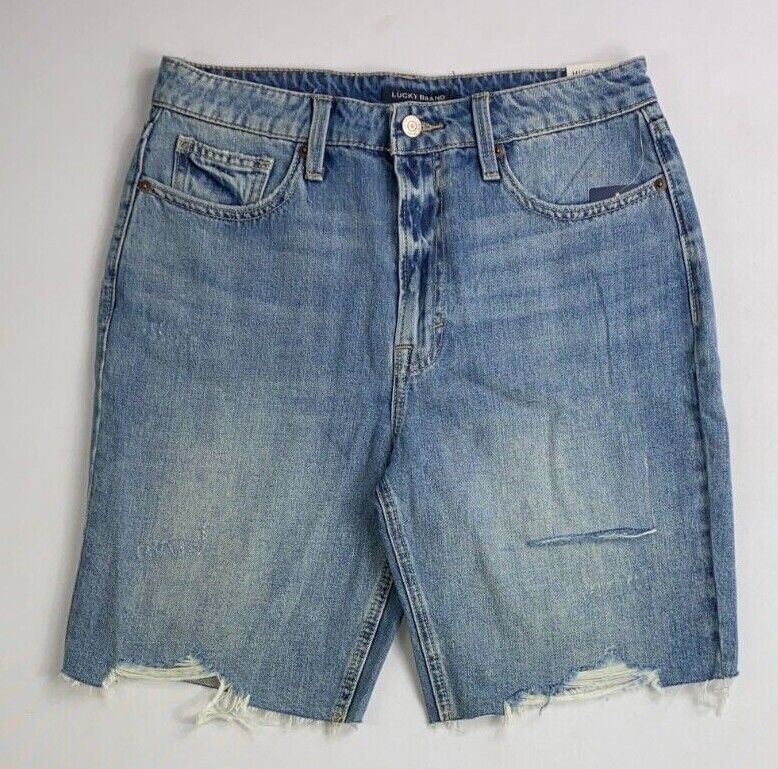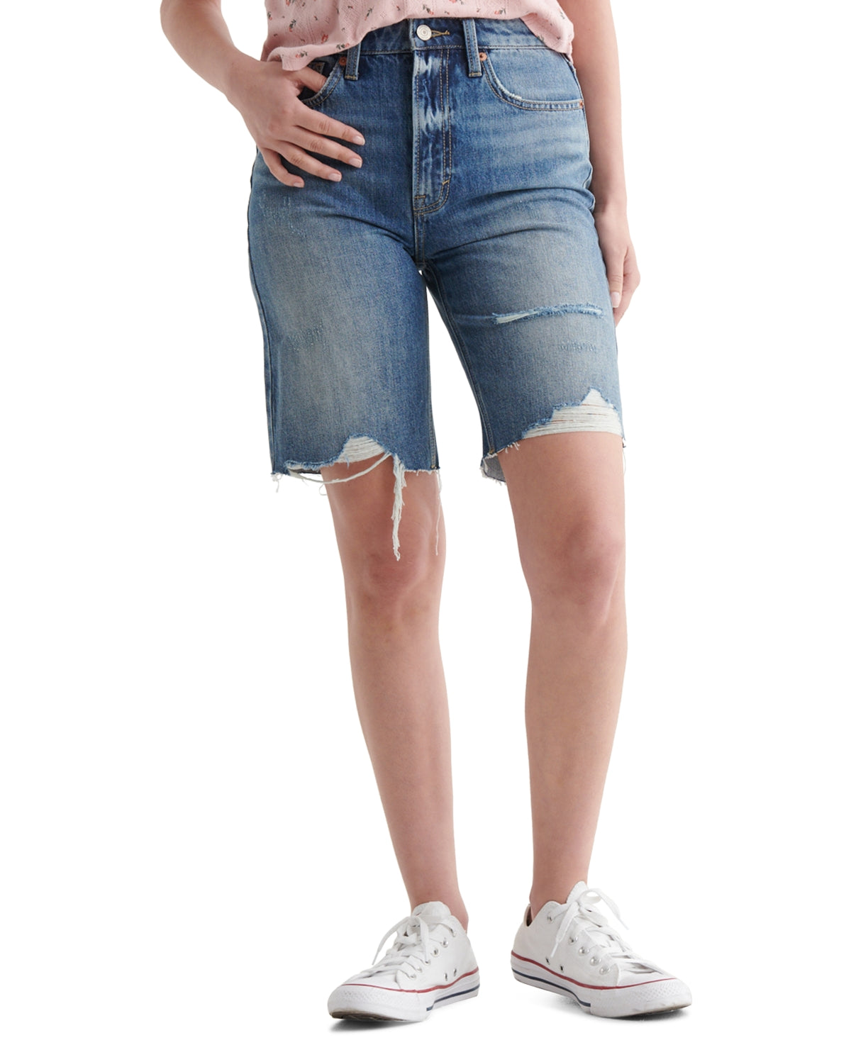Bermuda jeans feminina Lucky Brand com bainha destruída e corte reto, azul, tamanho 27