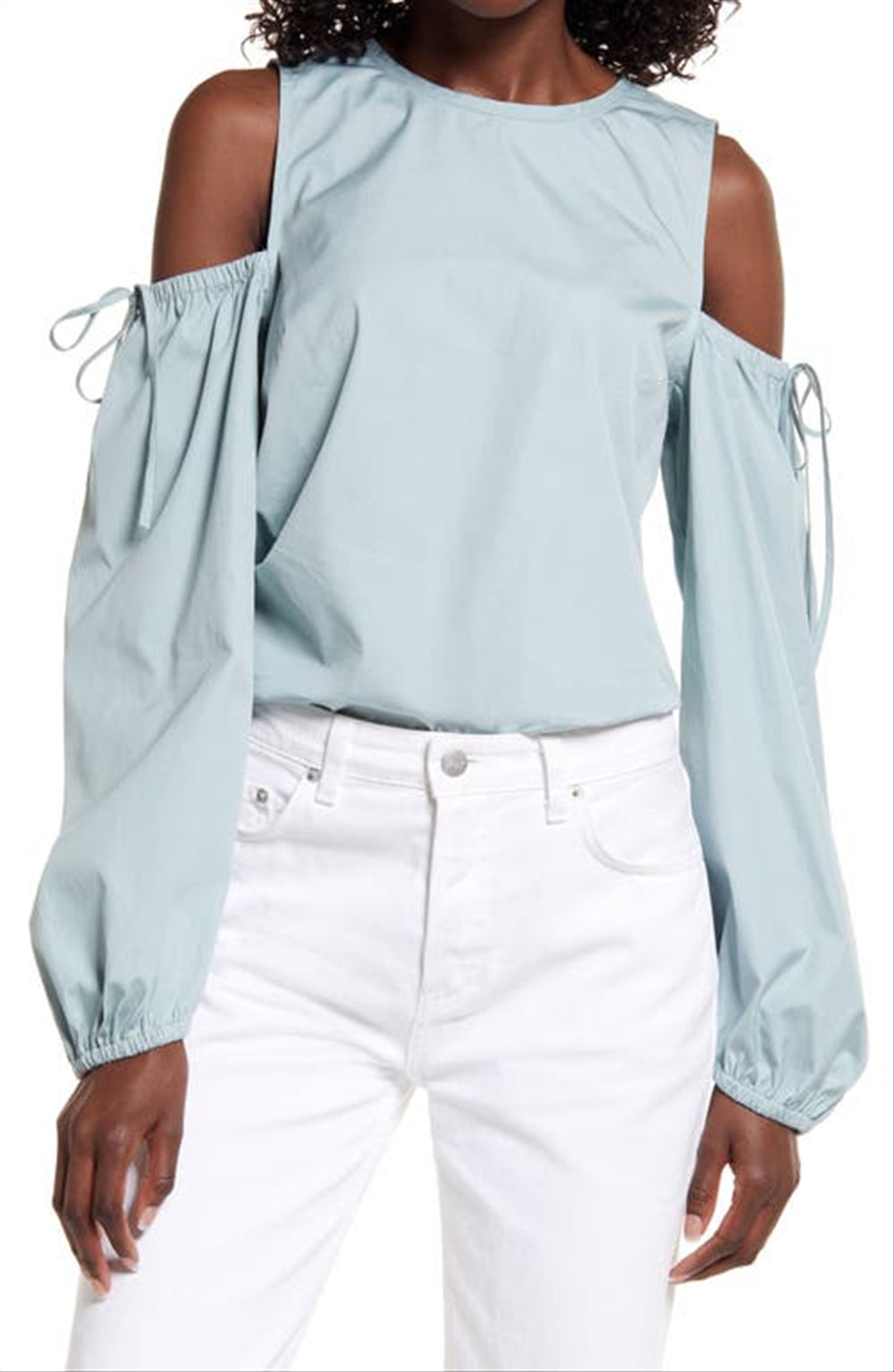 Design de ombros descobertos | Material de algodão confortável | Cor atraente Teal Mist | Tamanhos até médio | Marca popular Open Edit | Estilo popeline moderno | Disponível na Nordstrom | Respirável e leve | Fácil de estilizar | Lavável à máquina