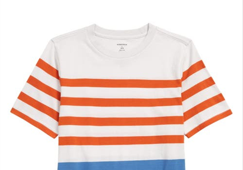 Design listrado em cinza nevoeiro | Material 100% algodão | Estilo clássico de gola redonda | Lavável à máquina | Mangas curtas | Ajuste confortável | Adequado para crianças | Vendido na Nordstrom | Padrão listrado | Uso diário versátil