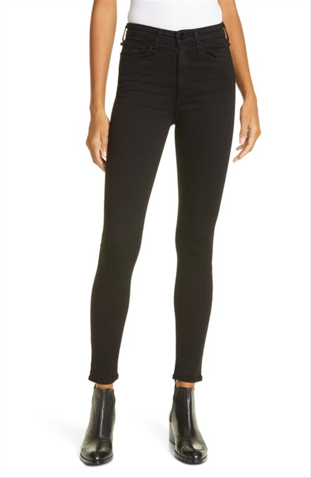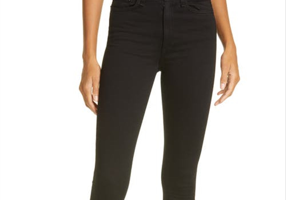 Design de cintura alta | Corte justo | Tecido durável | Cor preta | Tamanho 32 | Elástico confortável | Costura de qualidade | Detalhes sutis de desbotamento | Cinco bolsos clássicos | Marca Rag & Bone | Exclusivo Nordstrom