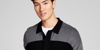 E agora este suéter masculino de gola redonda com blocos de cores cinza, tamanho médio