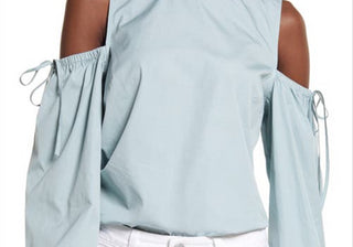 Camisa de popeline de algodão com ombros descobertos e edição aberta, tamanho médio, azul-petróleo