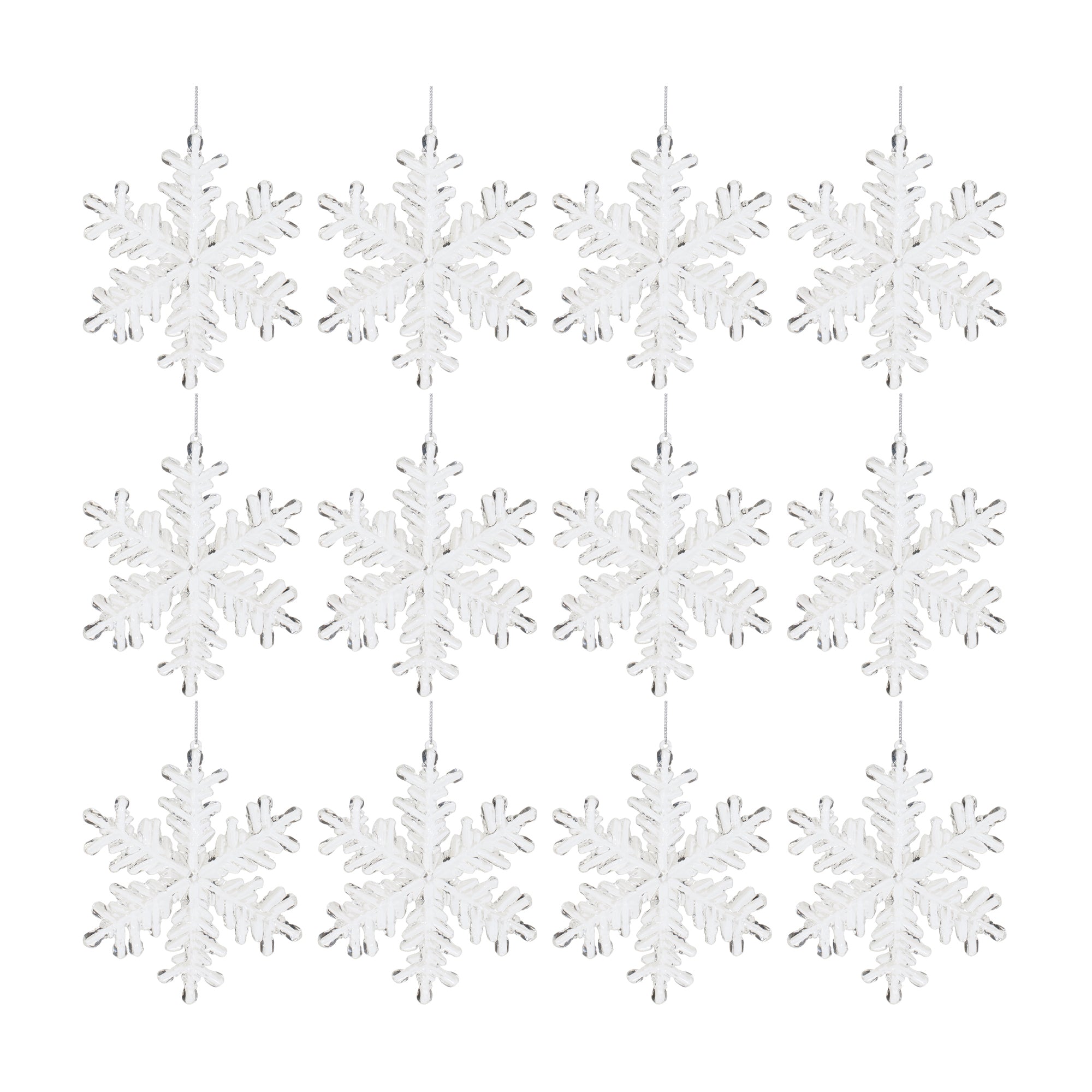 Add a touch of winter wonder to your holiday decor with this stunning set of Clear Acrylic Snowflake Ornaments. Designed to capture the beauty of real snowflakes, these chic ornaments bring a timeless elegance to your Christmas tree. The quality acrylic composition ensures durability, while the delicate silver string hanger makes decorating effortless. Whether adorning your home or gifting to a loved one, these ornaments will spread festive charm for seasons to come. Sold in a set of twelve matching pieces to create a balanced display on your Christmas tree.