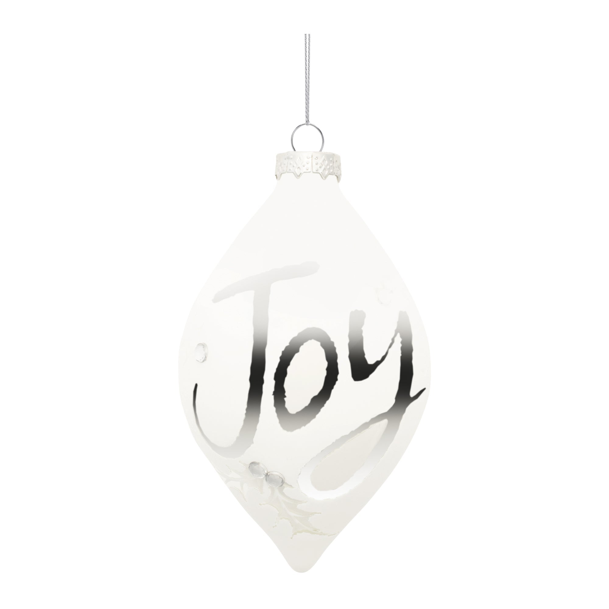 Celebrate the season with elegance and charm with the Frosted Glass Joy Ornaments. Featuring wintry white tones with metallic silver accents, these traditional ball and oblong shapes are adorned with the classic "joy" sentiment, beaded holly leaf, and glittered snowflake details. Sold in a set of 6 matching pieces with two assorted designs, these beautiful ornaments are perfect for adding a touch of traditional holiday cheer to your Christmas tree, wreath, or mantle garland.