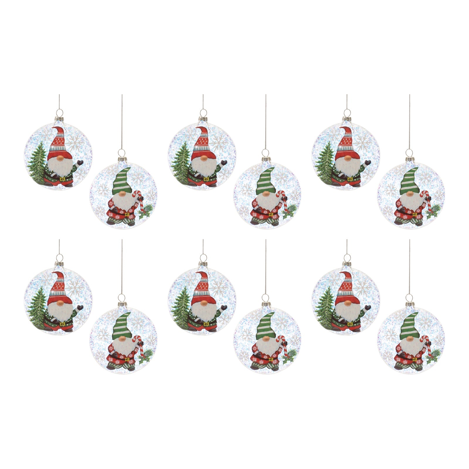 Bring festive cheer to your holiday decorations with this charming set of Gnome Ball Ornaments. Crafted from durable glass, these ornaments feature a delightful painted gnome design surrounded by snowflakes and pine tree accents. The rich red and green tones make them a perfect addition to your Christmas tree or as a thoughtful gift for loved ones. With a delicate silver string hanger, these ornaments are designed to last and will add a touch of whimsy and warmth to your home for years to come. Whether you're enhancing your own tree or gifting this set to someone special, these Gnome Ball Ornaments will spread smiles and holiday joy. Sold in a collection of twelve pieces with two assorted designs to create a balanced display on your Christmas tree.