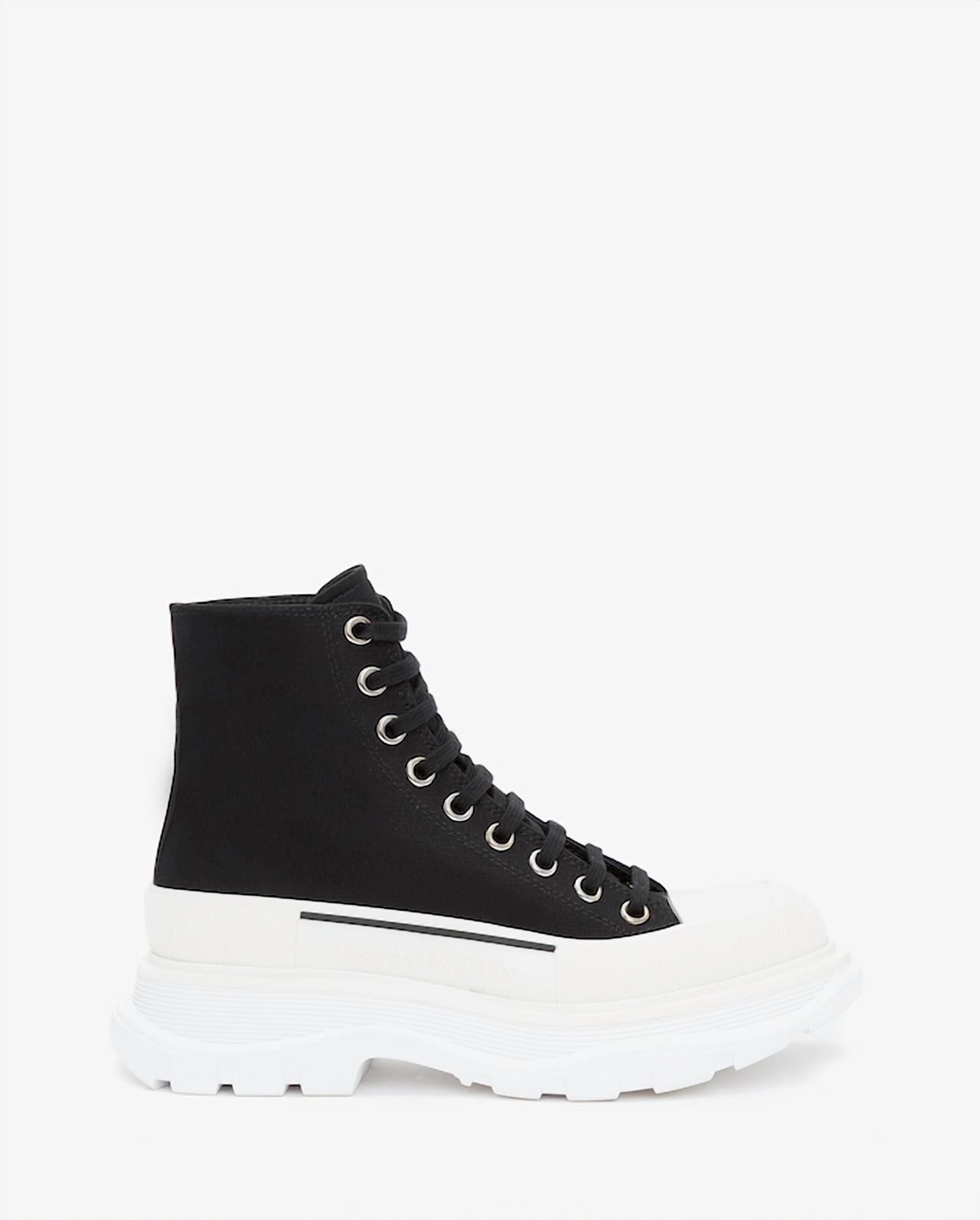Step into bold, modern style with this high-top black and white lace-up sneaker. Crafted from durable black canvas, this shoe features a chunky, oversized rubber tread sole for a striking silhouette and added traction. A textured rubber wrap and tonal Alexander McQueen signature elevate the design, while the signature ribbon at the heel adds a touch of brand distinction. Finished with a classic round toe and a structured rubber toe cap, this sneaker seamlessly blends edgy aesthetics with everyday comfort.