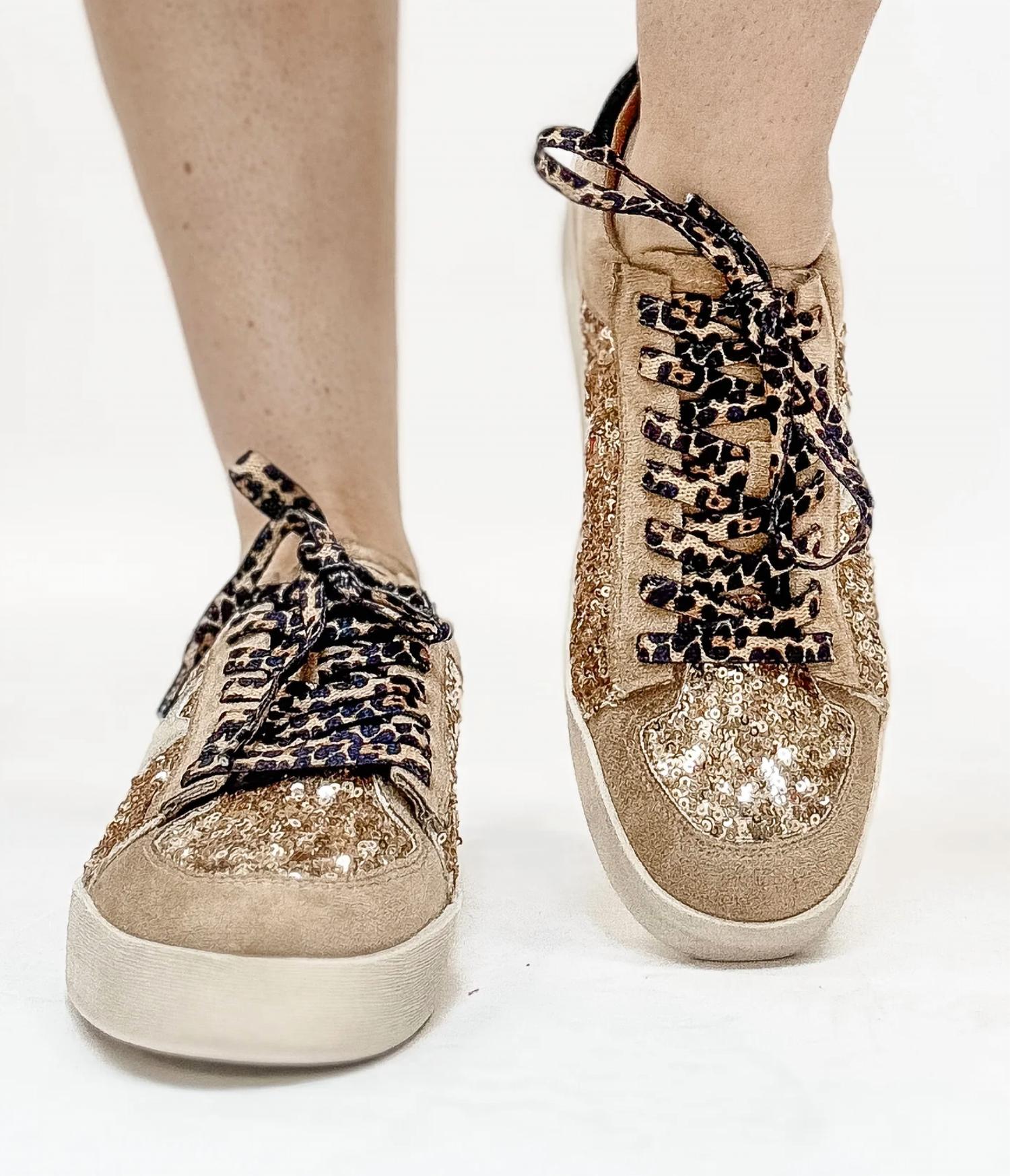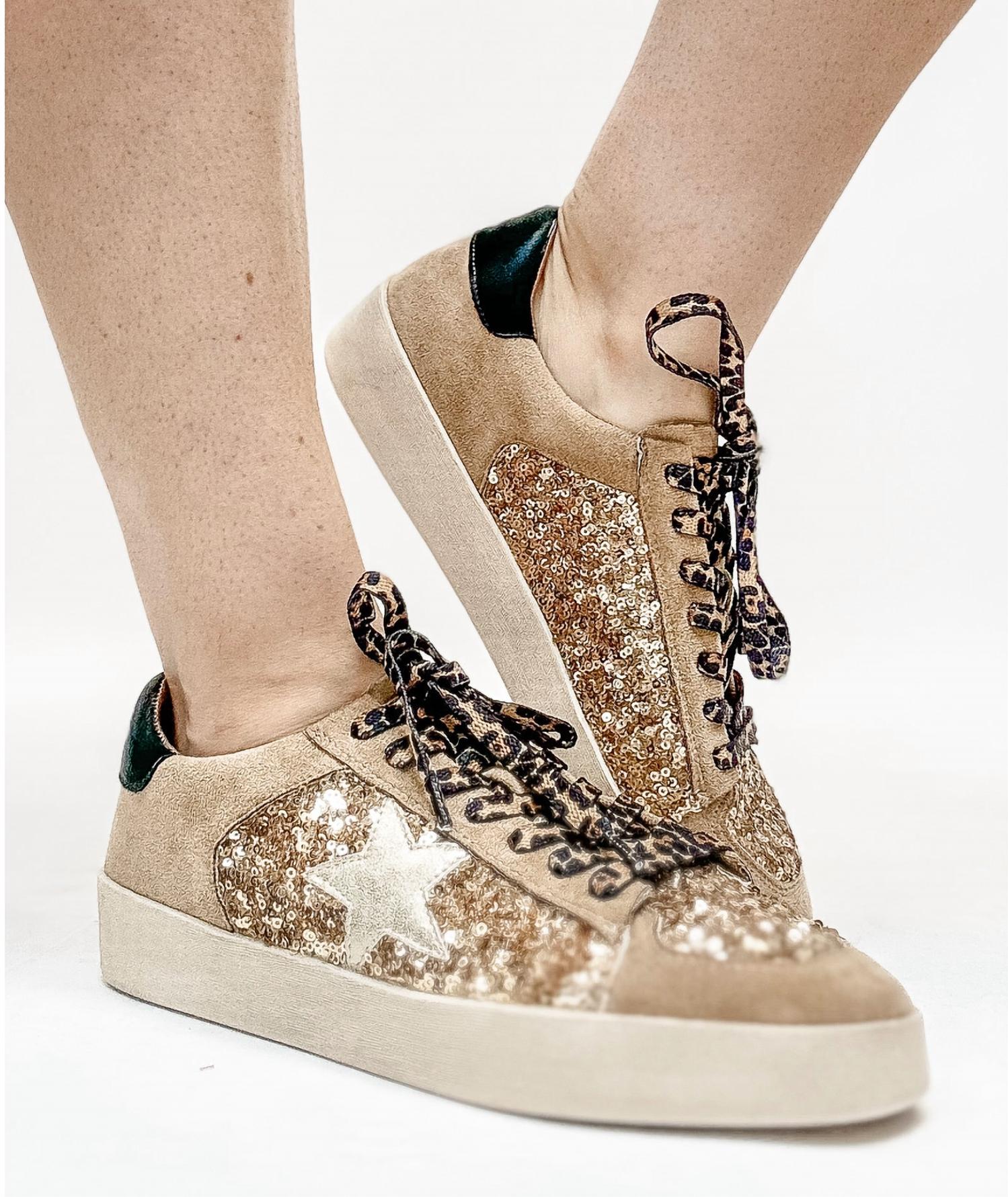 Bonitos, funcionais e confortáveis. Estes tênis atendem a todos os requisitos. Descubra o Tênis Feminino Another Round da Corkys Footwear, a combinação perfeita de estilo e ousadia com seu design chamativo de lantejoulas douradas. Estes tênis têm bico redondo, cadarços com estampa de oncinha e um detalhe de estrela metálica, adicionando um toque de glamour à sua coleção de calçados. Projetados para o conforto com um acabamento exclusivo em efeito sujo, eles oferecem um ajuste fiel ao tamanho, com sugestões de tamanhos maiores para meio número. Ideal para quem busca uma declaração de estilo a cada passo.