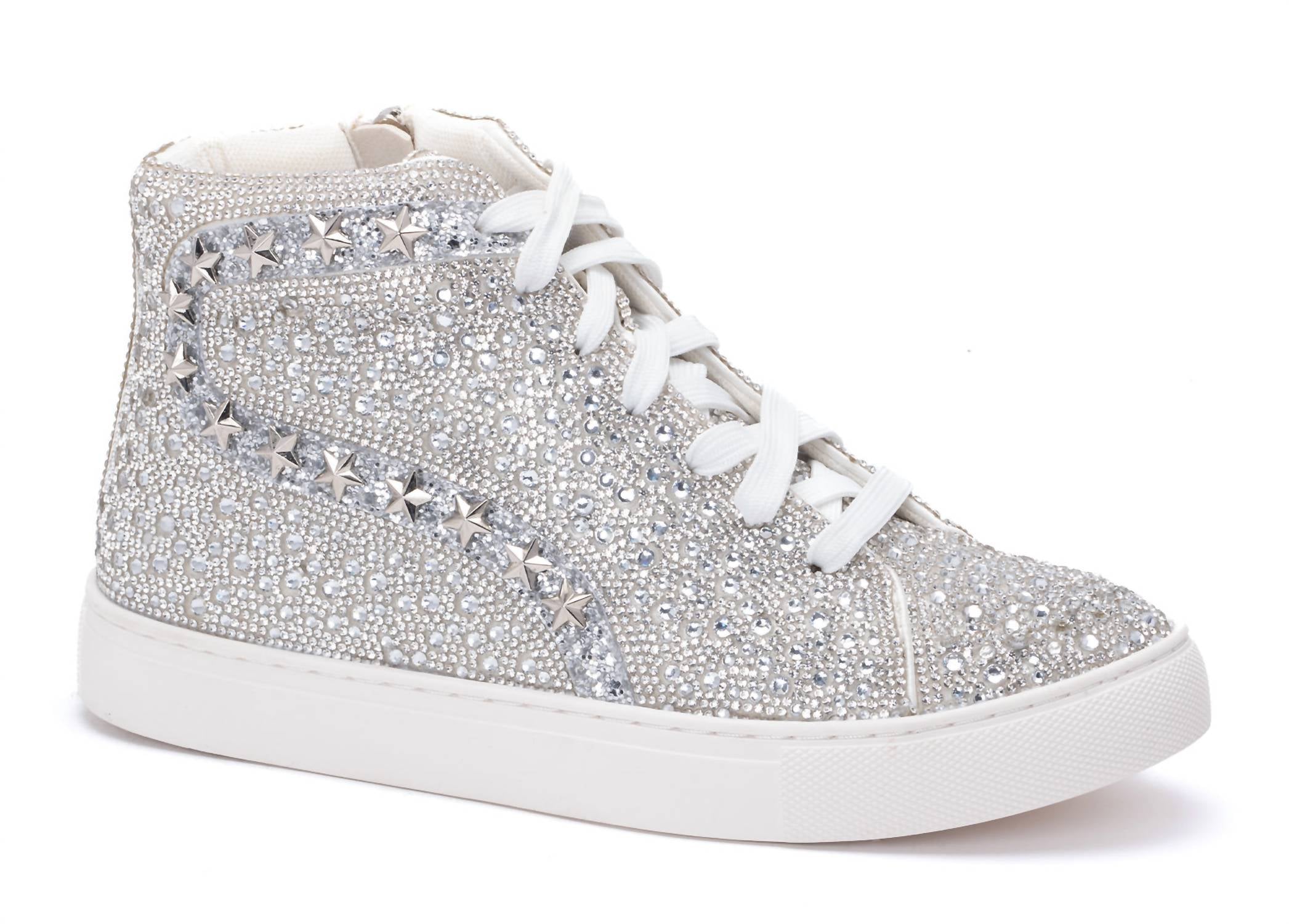 Tênis de cano alto deslumbrantes são uma peça de destaque. Adornados com strass e glitter para o máximo estilo. Projetados com salto baixo e plataforma de borracha de 2,5 cm. Apresentam bico arredondado e proporcionam o máximo conforto com palmilha acolchoada. Fiel ao tamanho. Recomenda-se ajuste de tamanho para quem usa meio tamanho para garantir o ajuste perfeito.