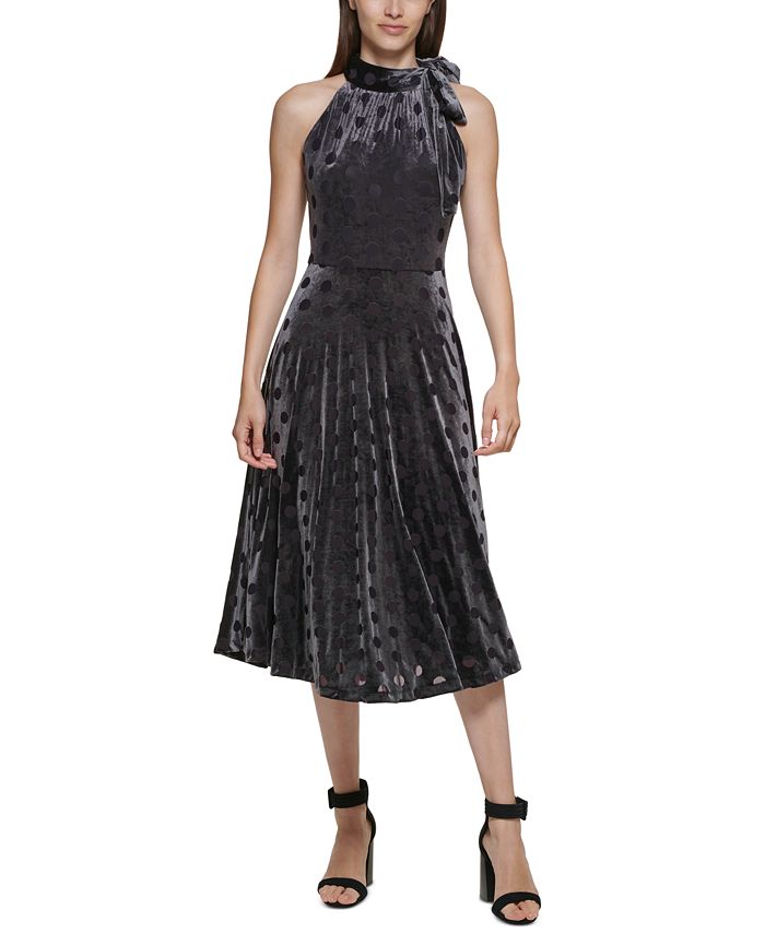 Arrase no look com o vestido frente única de bolinhas da Calvin Klein | confeccionado em veludo felpudo. | Comprimento aproximado de 45 cm, do centro do pescoço até a bainha. O comprimento é baseado no tamanho 6 e varia 1/4 entre os tamanhos | Cai abaixo do joelho até a panturrilha inferior | Gola falsa com fecho de amarrar; Modelo midi | Zíper invisível nas costas | Forrado