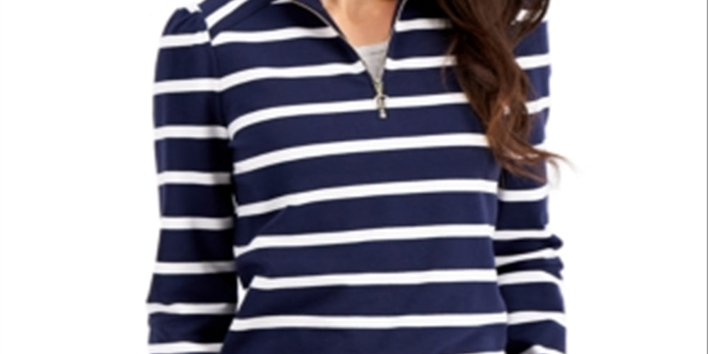 Opte por um visual elegante, mas confortável, com este pequeno suéter de algodão da Charter Club | um visual versátil com listras atemporais e fecho de zíper parcial no decote. | Ajustado; aprox. 24 de comprimento | Projetado para se ajustar e valorizar pessoas de 1,62 m ou menos | Decote falso com fecho de zíper parcial | Punhos e bainha canelados