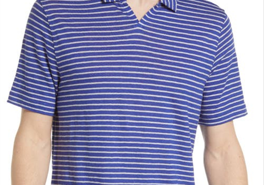 Material 100% linho puro | Design de gola Johnny | Padrão de listras Tioga azul C | Disponível no tamanho XX-Large | Vendido pela Nordstrom | Casual | Ajuste confortável | Lavável à máquina | Estilo de manga curta | Perfil polo clássico | Respirável para uso no verão | Cor azul neutra.