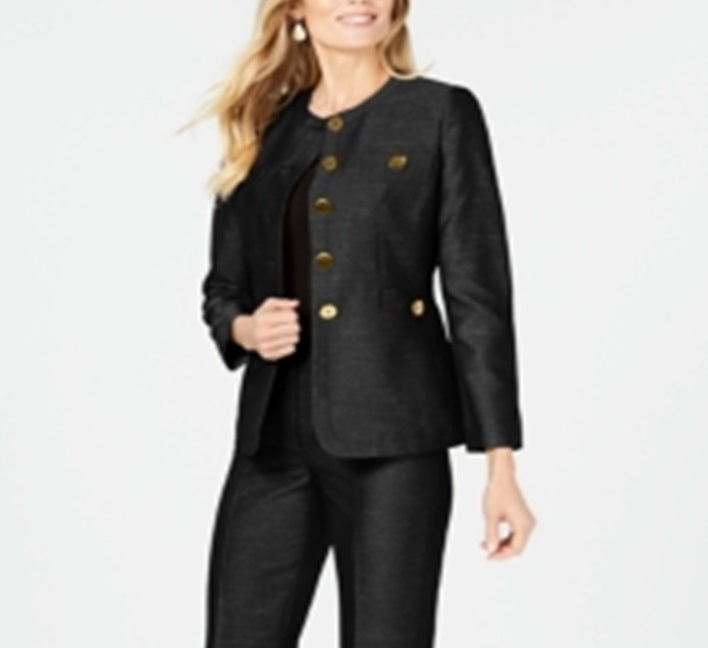 Consiga aquele look de trabalho perfeito e elegante com este terno de duas peças da Le Suit, com uma jaqueta ousada com detalhes de botões e calças elegantes de cintura média. Jaqueta; aprox. 25-1/2 de comprimento, sem gola, fechos de botão frontal.