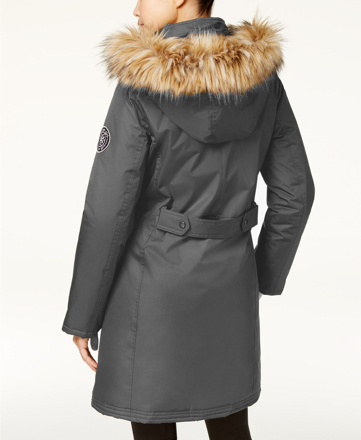 Peso médio | Cinto com aba de pressão na parte de trás da cintura | Gola alta; capuz removível com acabamento em sintético | Resistente à água | Bolsos com zíper e aba no quadril; bolsos com fenda de pressão no peito | Fecho de zíper na frente |