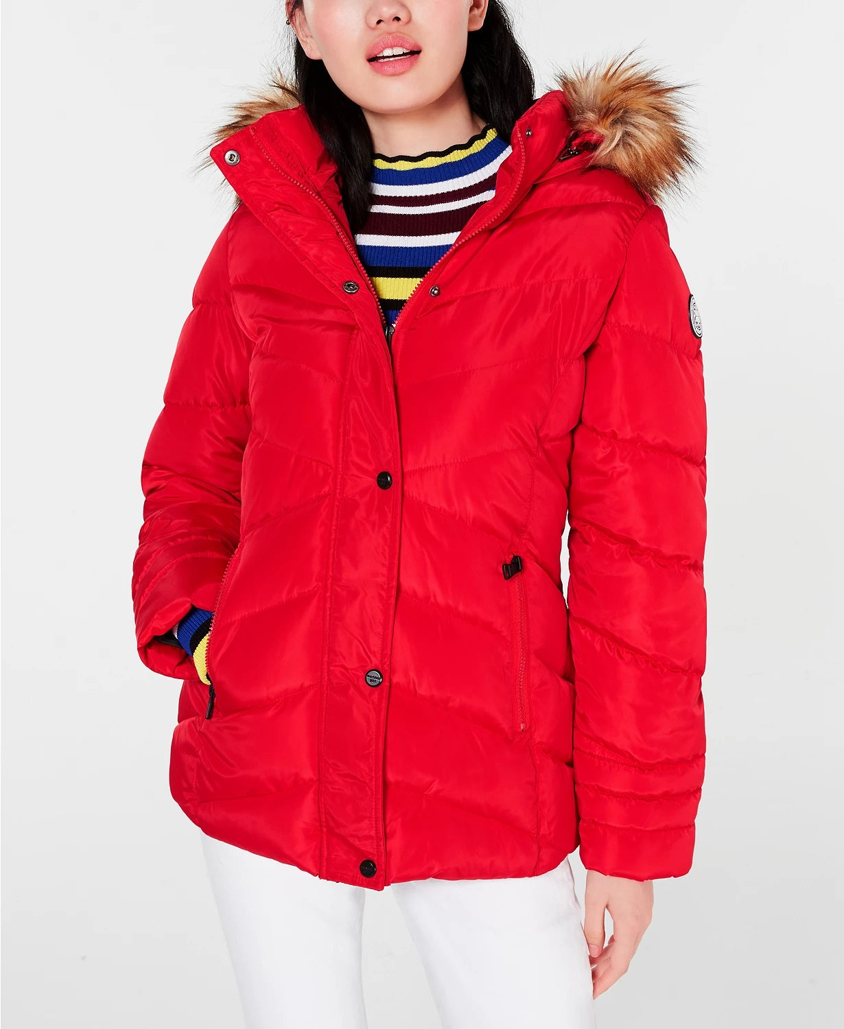 Casaco acolchoado com capuz e acabamento falso Madden Girl Junior, vermelho, tamanho X-S