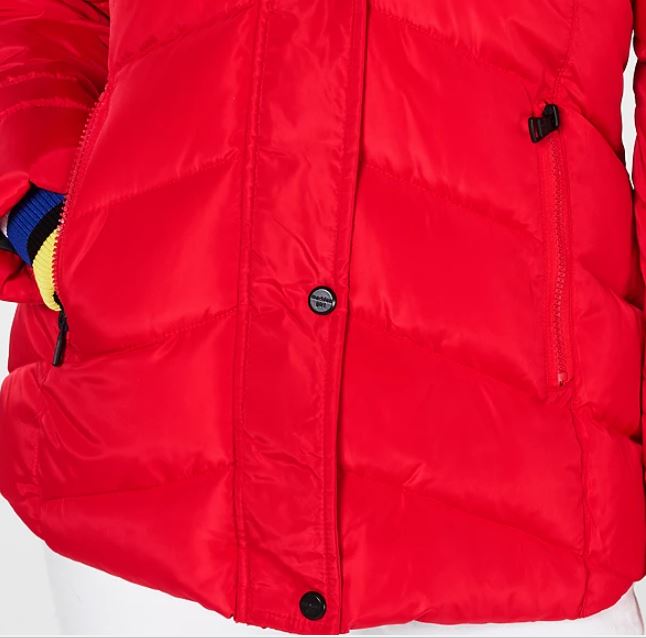 Aproximadamente 27-1/2" de comprimento do centro das costas até a bainha | Capuz removível com acabamento em sintético e gola alta; zíper frontal e fechos de pressão | Dois bolsos com zíper na frente | Forrado | Revestimento, forro e enchimento: poliéster; acabamento do capuz: sintético: acrílico/poliéster | Lavável à máquina