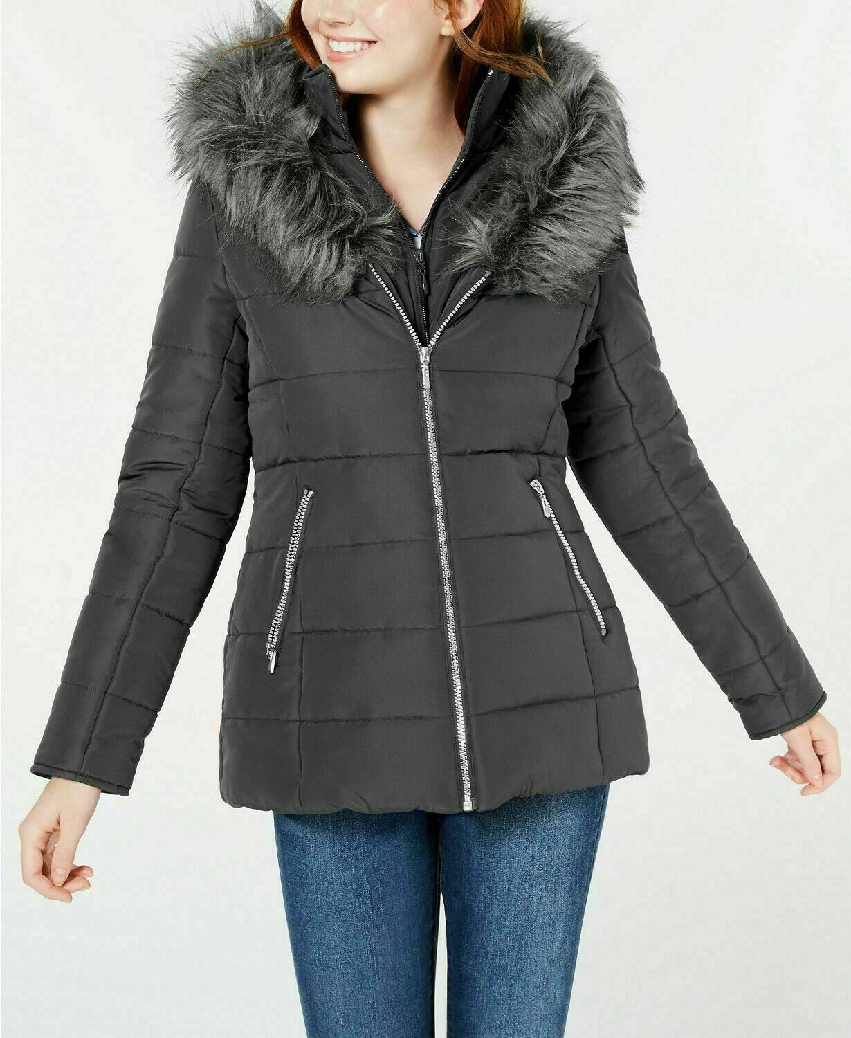 A modelo veste tamanho pequeno | Aproximadamente 69 cm de comprimento do centro das costas até a bainha | Capuz com acabamento em material sintético e gola alta; fecho de zíper frontal | Resistente à água | Dois bolsos na frente | Forrado | Revestimento, forro, enchimento, sintético: poliéster