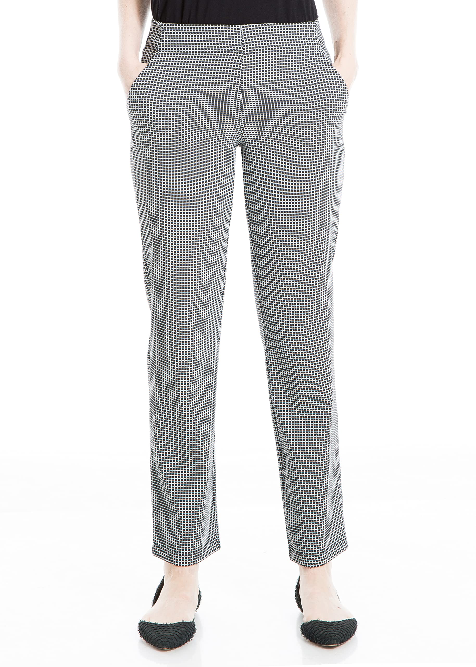 Calça feminina Max Studio preta e branca com estampa geométrica e perna reta, tamanho extrapequeno