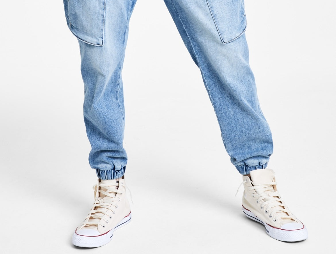 Mantenha seu estilo urbano confortável com o jeans supermacio e o cós com cordão seguro destas calças cargo jogger Encinita da Sun + Stone. | Comprimento interno aproximado; 29 | Cintura média | Caimento regular | Cós com cordão | Dois bolsos laterais para as mãos; dois bolsos cargo nas pernas; dois bolsos embutidos nas costas | Punhos elásticos