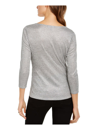 INC Top feminino prateado canelado com brilho e manga comprida com decote em V, tamanho X-S