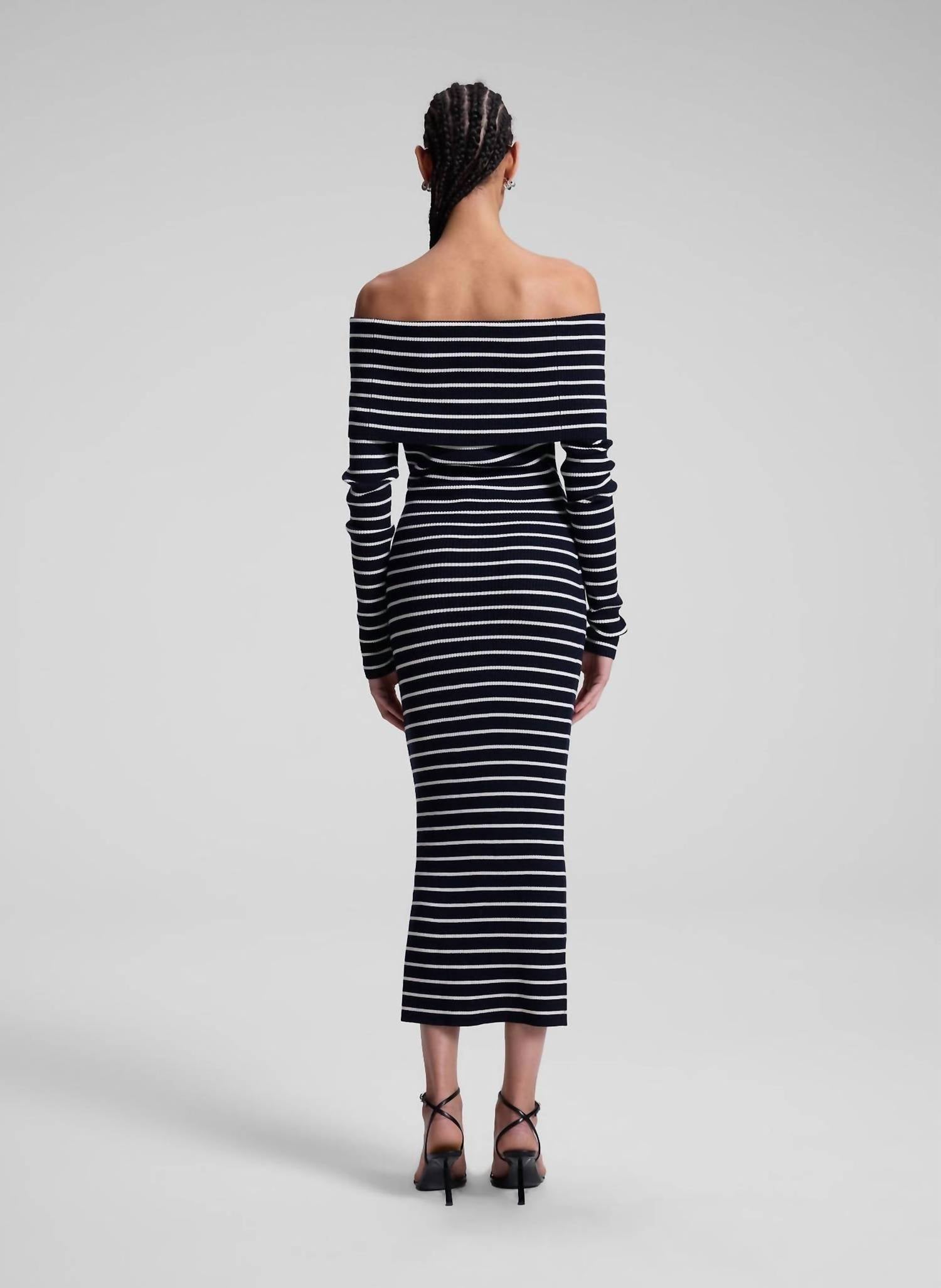 Elevate your vacation wardrobe with the A.L.C. Evelyn Stripe Dress in a chic white and midnight color palette. This wool blend midi dress features long sleeves and an off-the-shoulder neckline, exuding a minimalist bodycon silhouette that hugs your curves. Made from a luxurious merino wool and polyester mix(94% Merino Wool, 6% Polyester), its slipover style ensures ease of wear. Always look your best by adhering to its dry clean-only care instructions, perfect for summer occasions.