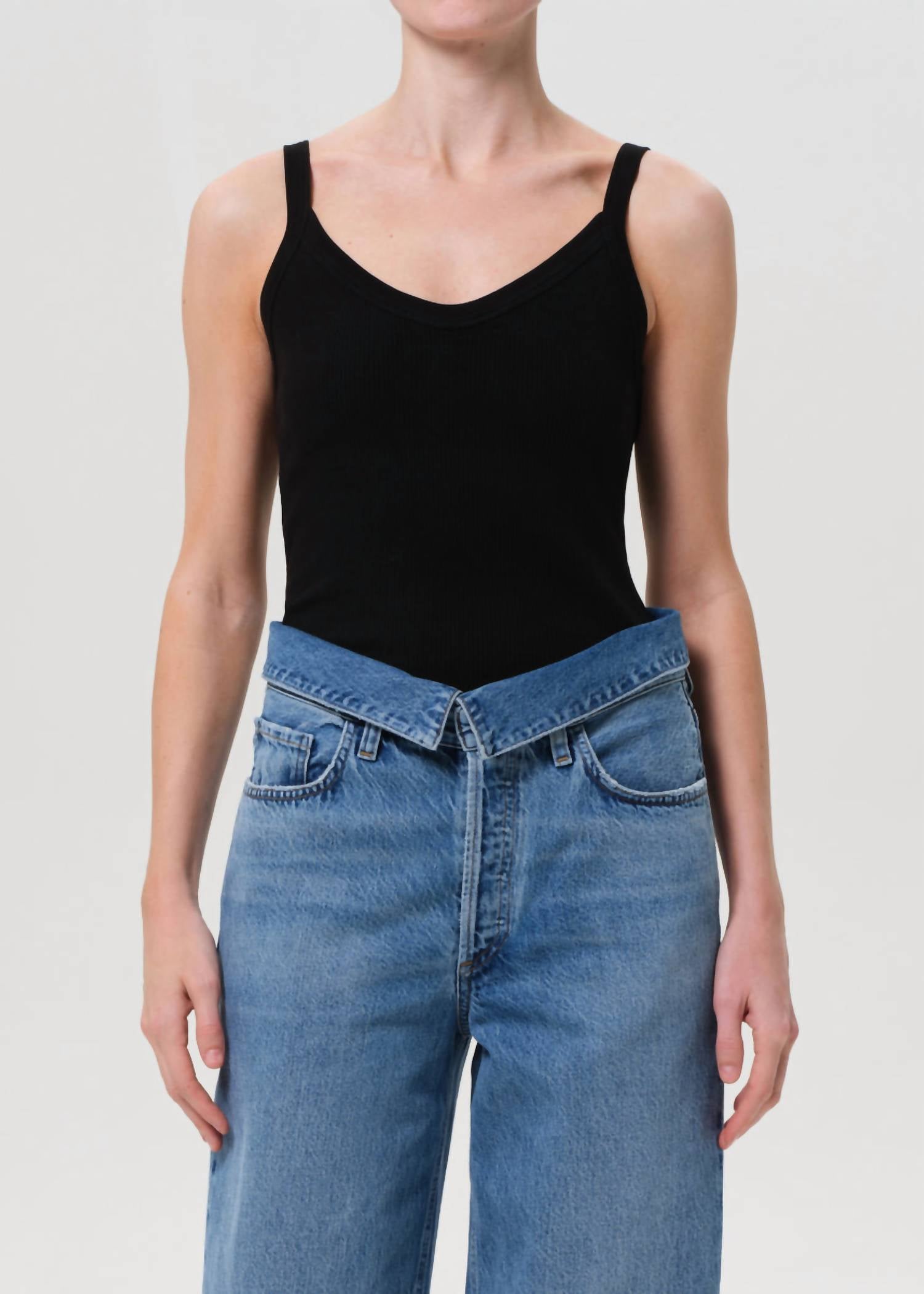 The perfect tank top for those warmer weather seasons. The Jordan Tank Top by AGOLDE is a sleeveless essential crafted from organic cotton in a chic black hue. This V-neck tank showcases AGOLDE's signature ribbed fabric, providing a smooth and flattering fit. Easily worn as a pull-on piece, its minimalist and solid pattern design makes it perfect for summer vacations, ideal for pairing with high-waisted jeans or skirts. For optimal care, hand wash this wardrobe staple to maintain its effortless style.
