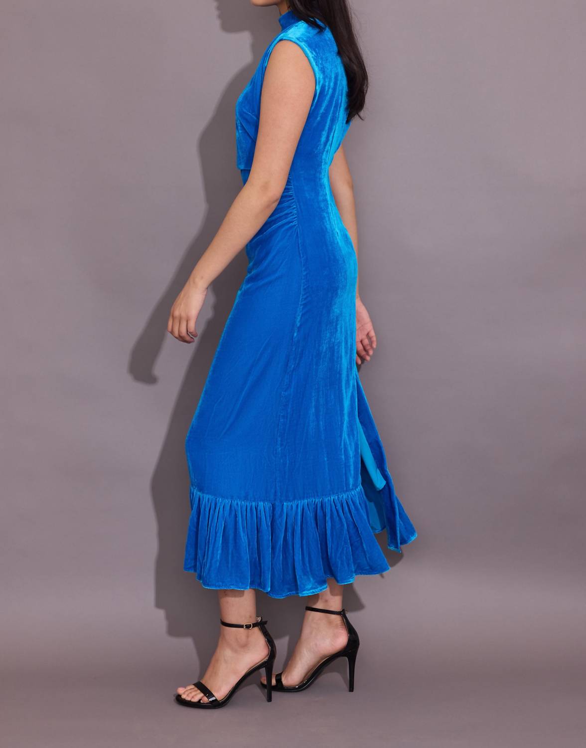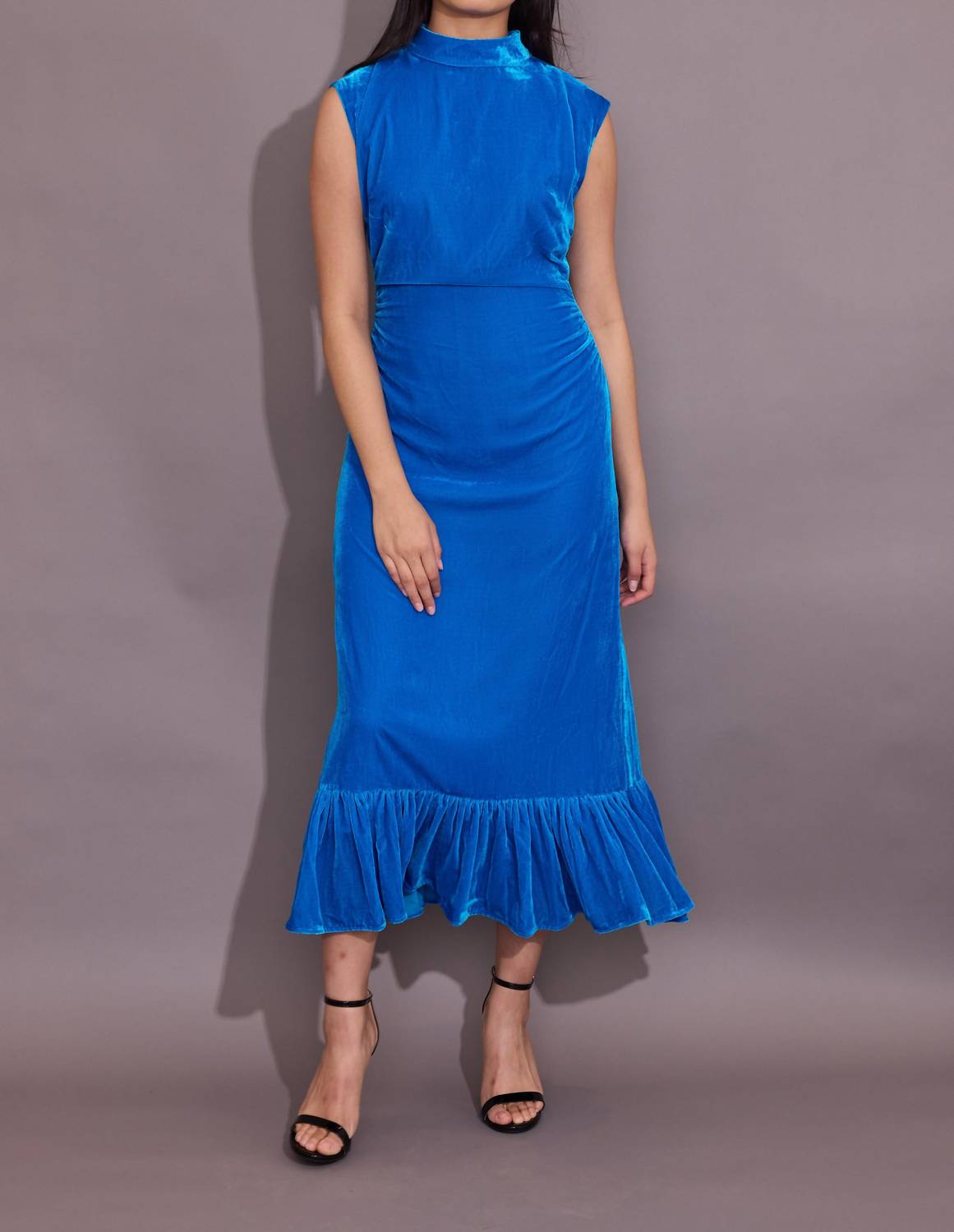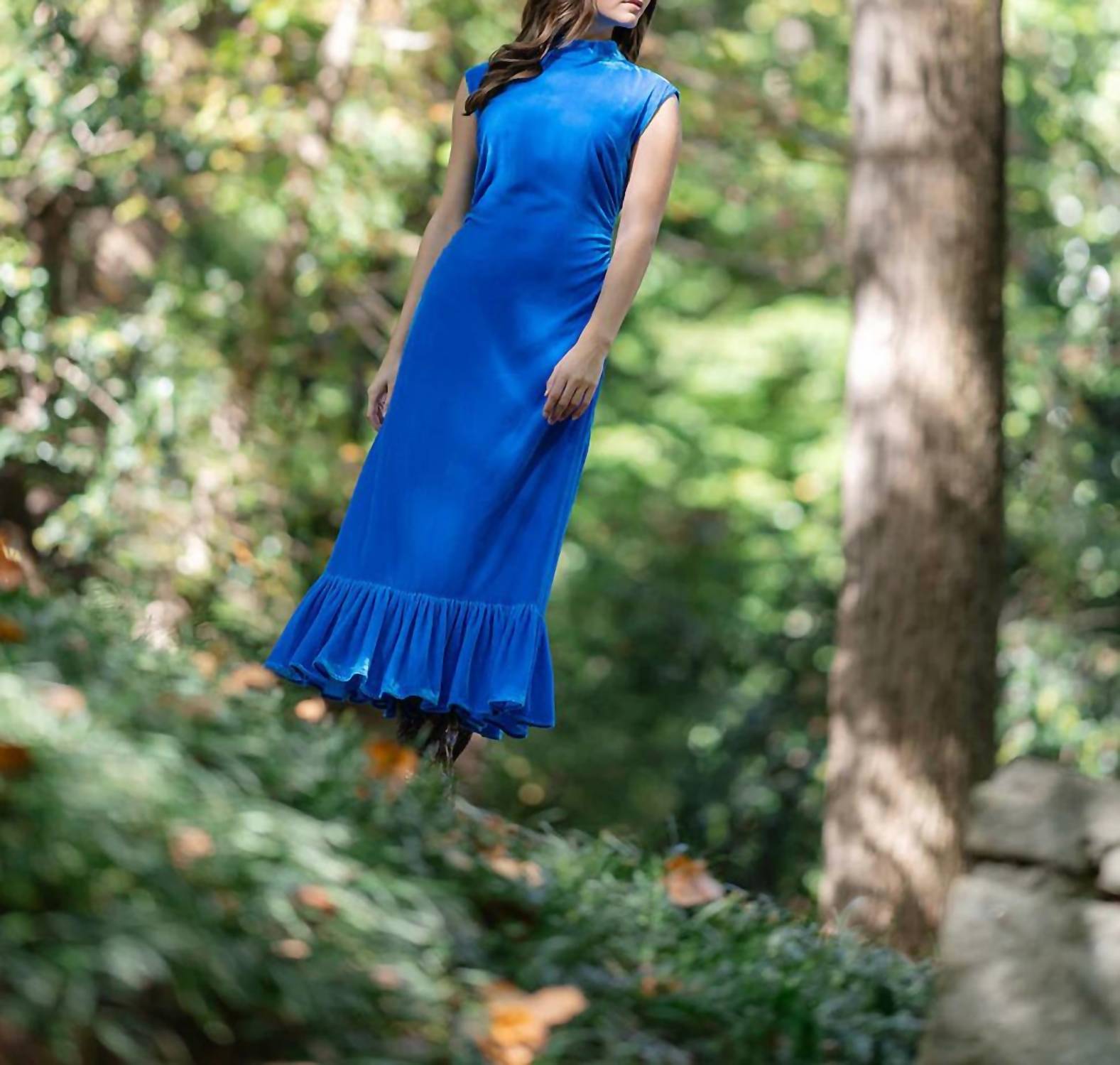 Style this maxi with your favorite statement necklace and sandals for the perfect look. Introducing the Estelle Velvet Maxi Dress by Alden Adair, a stunning addition to your winter wardrobe in elegant sapphire. This sleeveless sheath dress features a form-fitting maxi style with ruffle details and a classic mockneck, ideal for evening events. Crafted from 100% polyester, it boasts a convenient zip closure and is thoughtfully lined. Care instructions include machine wash cold and tumble dry low, ensuring easy maintenance. Made in China, this dress is perfect for bringing an air of quiet luxury to your New Year's Eve celebrations. Model is wearing a size S.