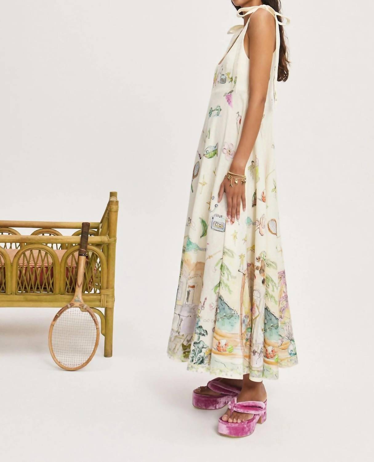 Elevate your holiday party attire with the Anouk Ballet Sundress by ALEMAIS, featuring artwork in collaboration with Anouk Colantoni. This sleeveless, A-line midi sundress is crafted from 100% European Linen in a chic cream color. Its design includes a shirred panel at the back bodice, tie-up straps, inseam pockets, and a convenient side zipper closure. The scoopneck silhouette and graphic pattern make it a standout piece for any spring occasion.