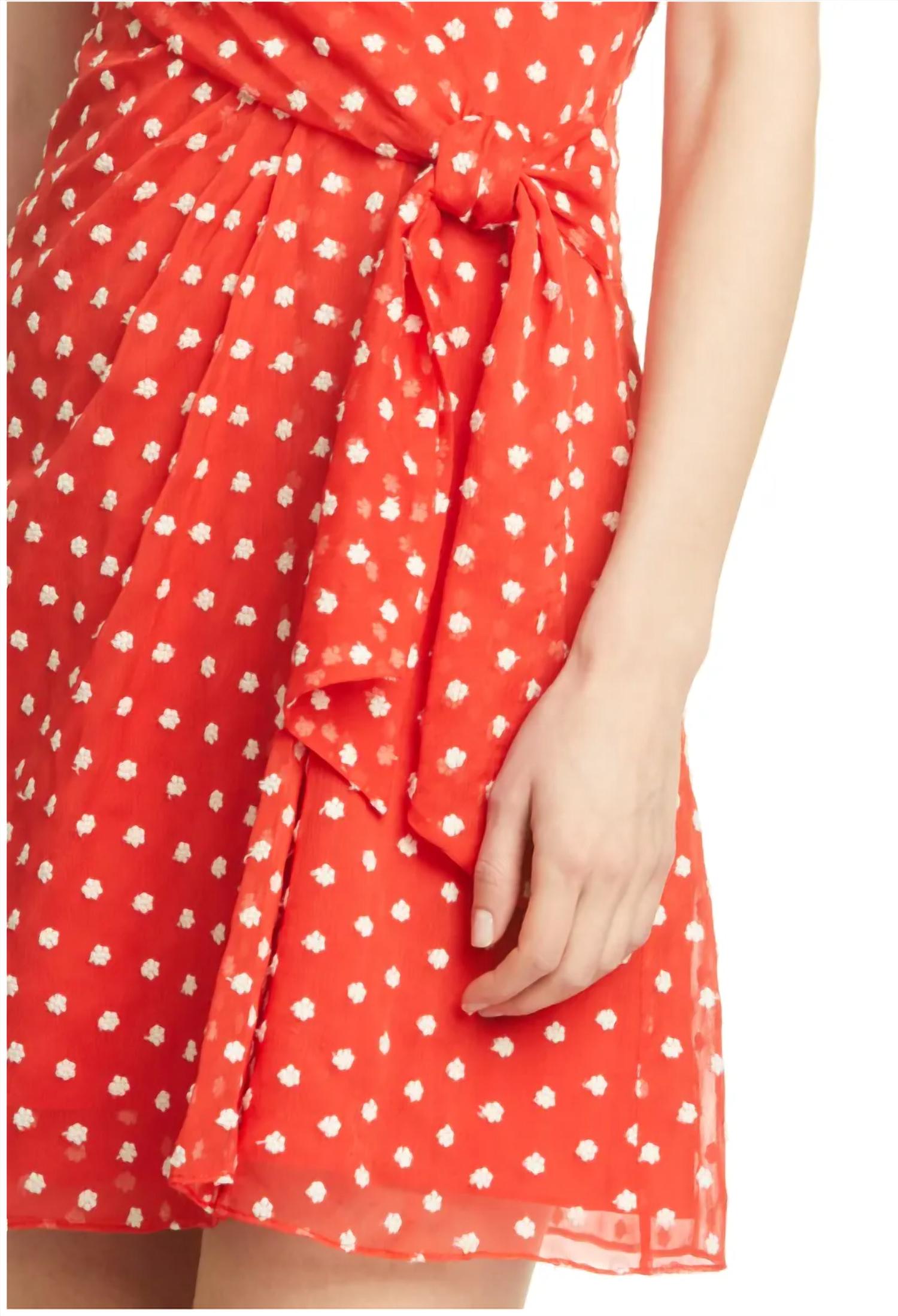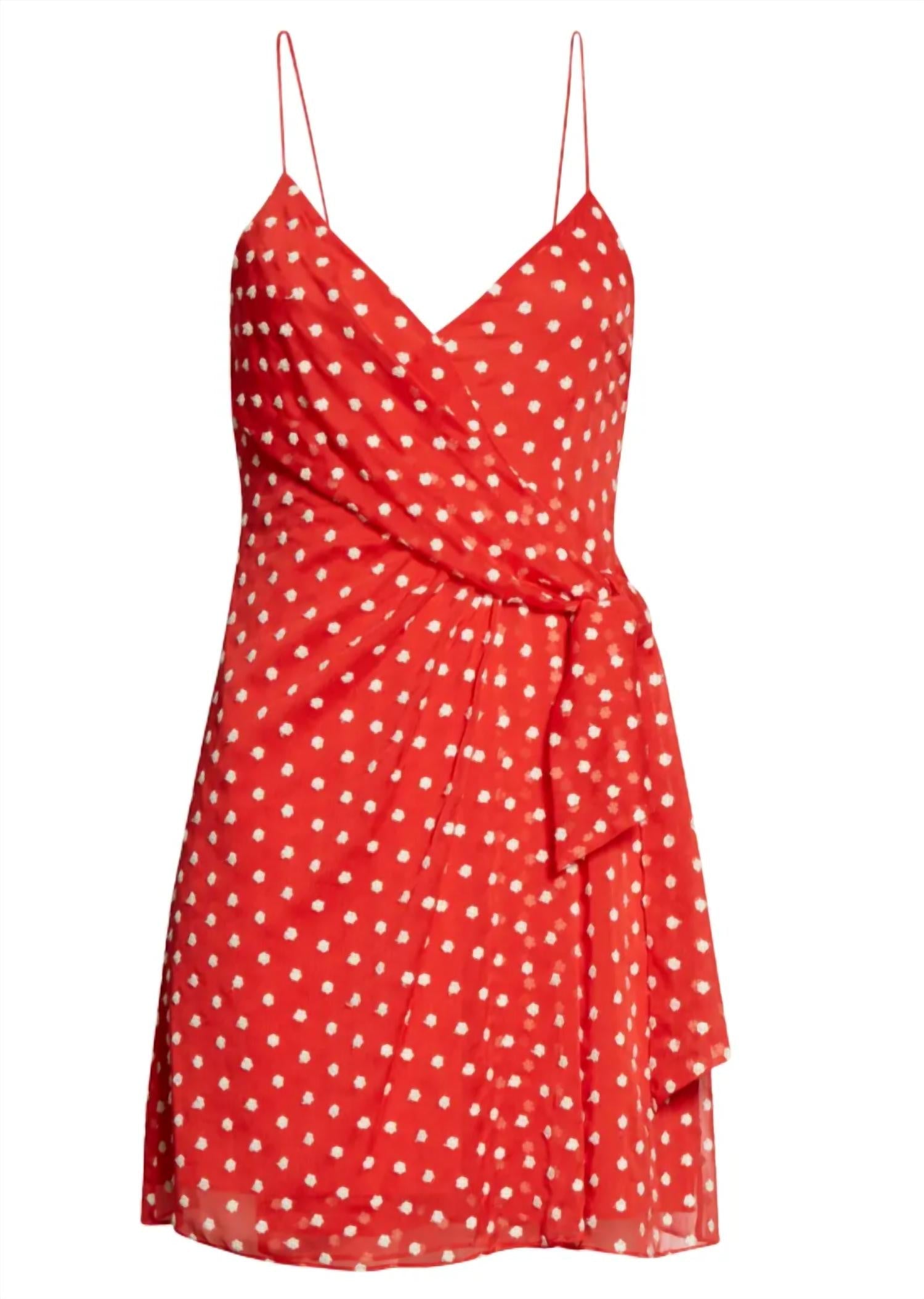 The kind of easy and flattering dress you'll be reaching for all season long. Introducing the Katie Tie Wrap Mini Dress by alice + olivia, a stunning addition to your wardrobe with whimsical flair. Exquisitely styled with spaghetti straps, this vibrant minidress is crafted from 70% polyester and 30% cotton, lined with 100% polyester contrast. Its graceful 33" length flows to an A-line silhouette, adorned in a charming white daisy floral pattern. Featuring an exposed back zip closure and a flattering surplice V-neck, it’s perfect for making a bold statement on warm nights out. Measurement details include a 15" chest and 14" waist, designed for size 2. Dry clean only to maintain its pristine appeal.
