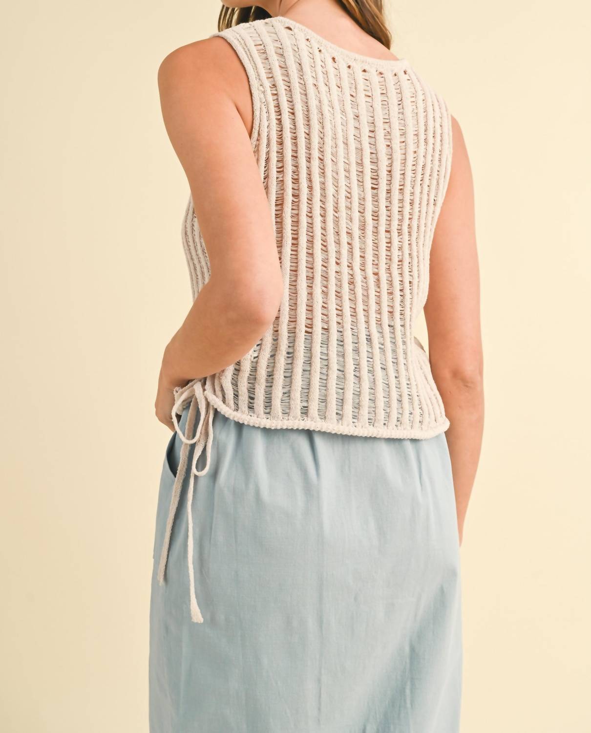 Introducing the Western Wisp Knit Tank Top by AnnieWear, a sleeveless piece in a versatile oatmeal hue. Crafted from a blend of 50% Viscose, 28% Polyester, and 22% Nylon, this tank features a striped pattern and modern western charm with side lace-up detailing. Designed with a pull-on closure, it showcases a relaxed fit and vertical lines for a flattering silhouette. Perfect for layering, its breezy texture makes it an ideal choice for effortless, everyday style.