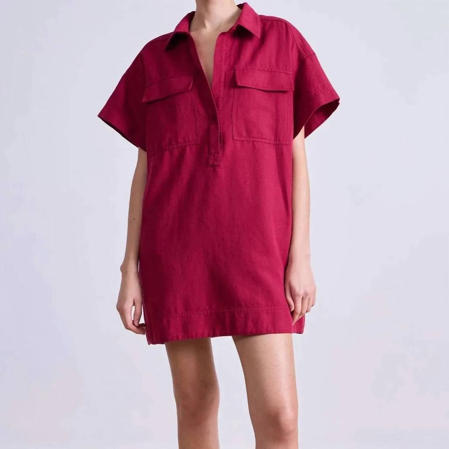 Presenting the Stefana Shift Mini Dress by APIECE APART, an elegant addition to your wardrobe in vibrant Rumba Red. Crafted from a blend of 60% organic cotton and 40% linen, this piece features short puff sleeves and a shift silhouette with a center front slit. With a button closure and a removable self-tie belt, the dress is both stylish and functional, including pockets for added convenience. Ideal for holiday parties and minimalist springtime occasions, its maxi length gives it a graceful touch.