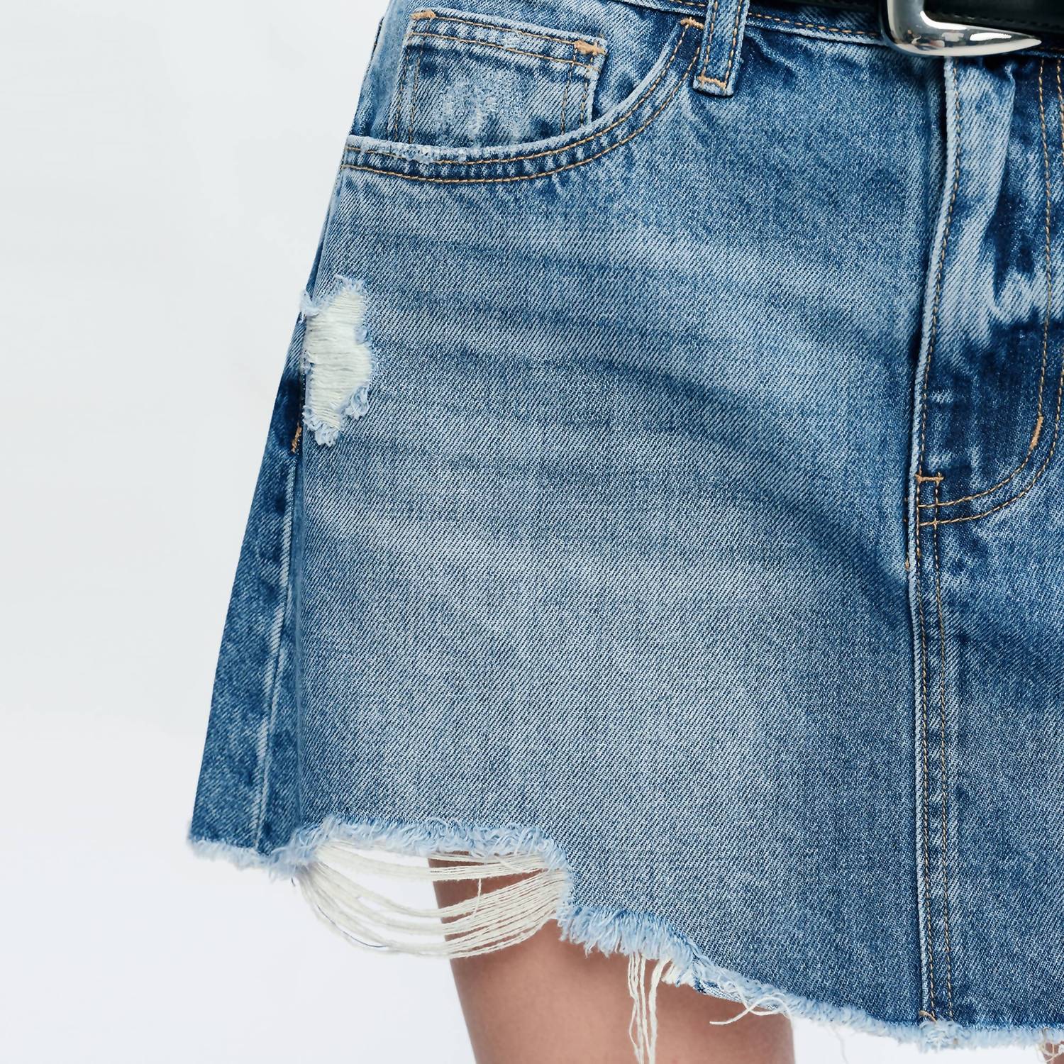 Step into summer style with the Gloria Denim Mini Skirt by Bayeas, the concert-ready staple your wardrobe needs. Crafted from 100% cotton in a solid medium blue, this skirt features a classic five-pocket design and a flattering A-line silhouette. The zip closure brings effortless edge with its distressed details and frayed hem. Care: Machine wash cold, do not bleach, tumble dry low.