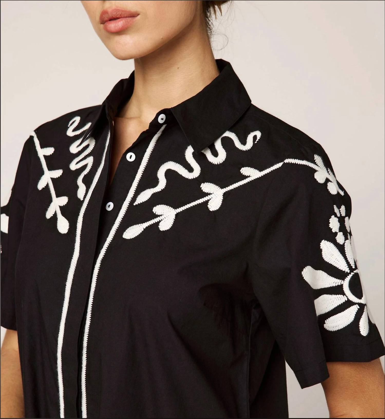 Discover effortless style with the Women's Riya Mini Dress by Cleobella, featuring short sleeves and crafted from GOTS-certified organic cotton poplin. This 33.75-inch dress is ethically handmade in India, showcasing a relaxed, button-down silhouette with a structured collar and intricate white embroidery on rich black fabric. Closure: Button closure. Care: Hand wash and lay flat to dry.