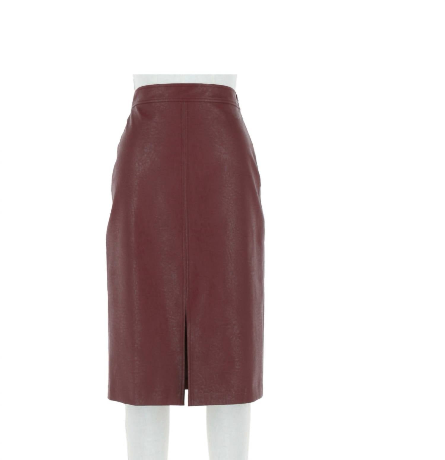 Tuck your favorite tee into this midi length skirt for an effortlessly cool look. Introducing the Leather Split Front Pencil Skirt by DAVID LERNER, a sophisticated choice for evening events in a striking wine hue. This midi-length, solid-patterned skirt is crafted from luxurious vegan leather and features a stylish front split, adding a touch of drama to your look. Closure is secured with a tie closure. Care: Dry clean only.