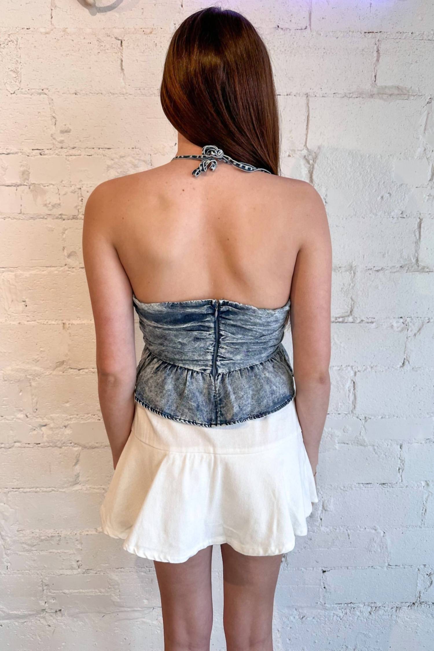 The perfect mini skirt does exist. Introduce elegance to your fall wardrobe with the Peplum Denim Skirt by Day + Moon, a modern take on a classic streetwear piece. This white mini skirt highlights a solid design with a playful peplum flare, ensuring a flattering silhouette that enhances the waist and hips. Fabricated from 100% cotton, it promises a structured yet soft touch perfect for evening events and Thanksgiving gatherings. Care is effortless: simply hand wash cold and line dry to maintain its stunning form. Model Bella, with a height of 5’7”, bust 34”, waist 26”, and hips 36”, wears a size small.