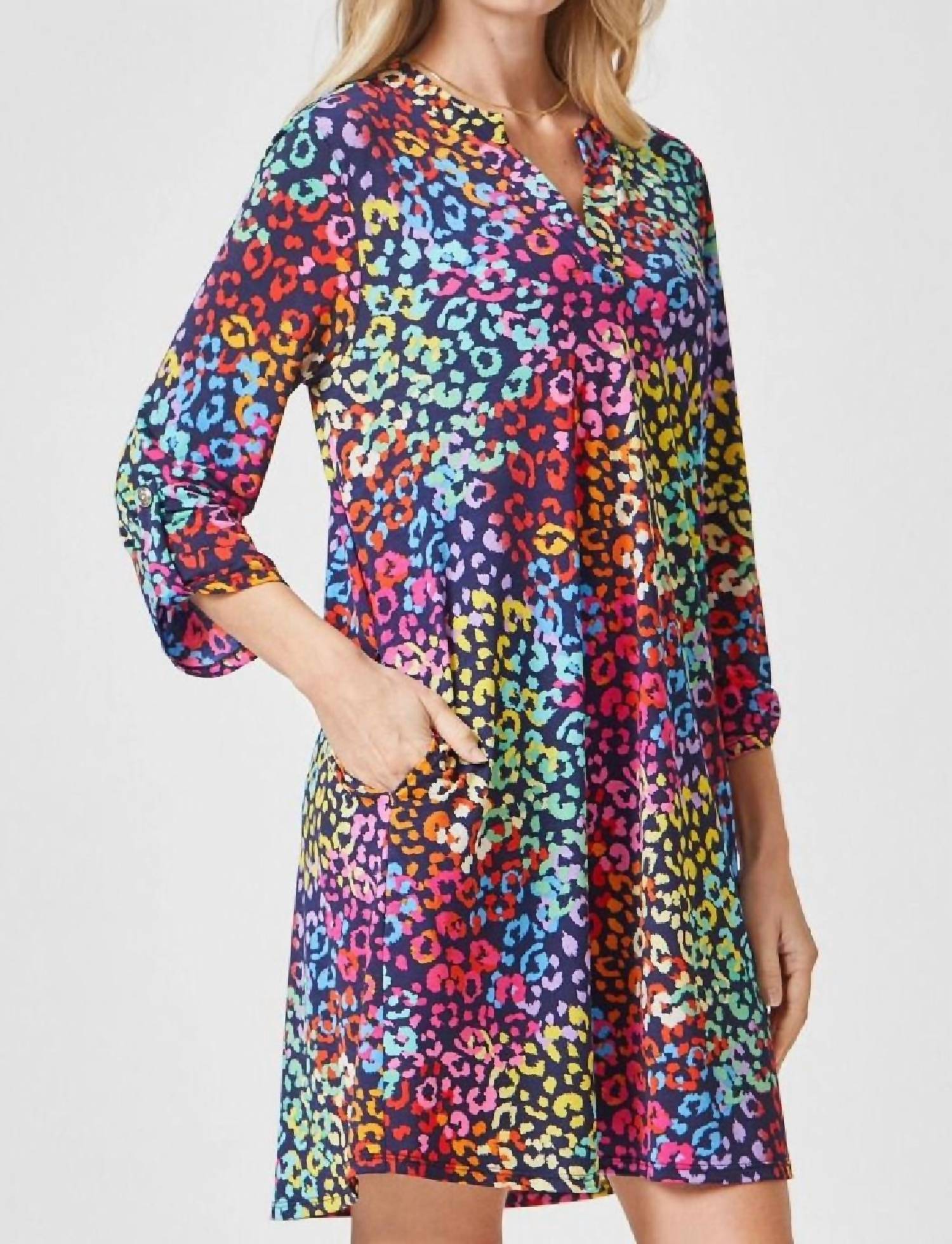 The kind of easy and flattering dress you'll be reaching for all season long. Introducing the Scarlett Mini Dress by Dear Scarlett, a chic and maximalist choice in Navy Multi designed for style-conscious women. This patterned mini dress features three-quarter tabbed sleeves and a flattering shift silhouette with a V-neckline. Made with a stretchy composition of 95% Polyester and 5% Spandex, this wrinkle-free knit offers comfort without compromising style. Easy to wear with a pull-on closure, it includes pockets for convenience and requires a gentle hand wash and line dry care.