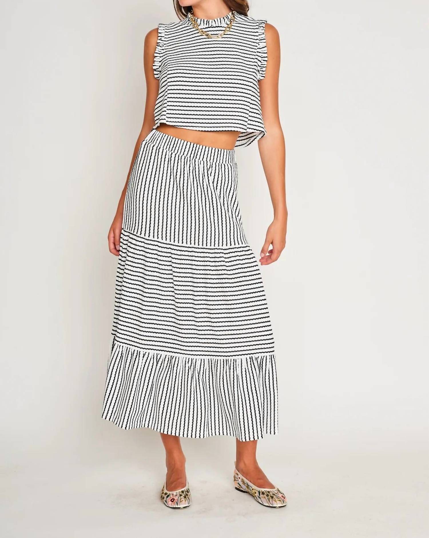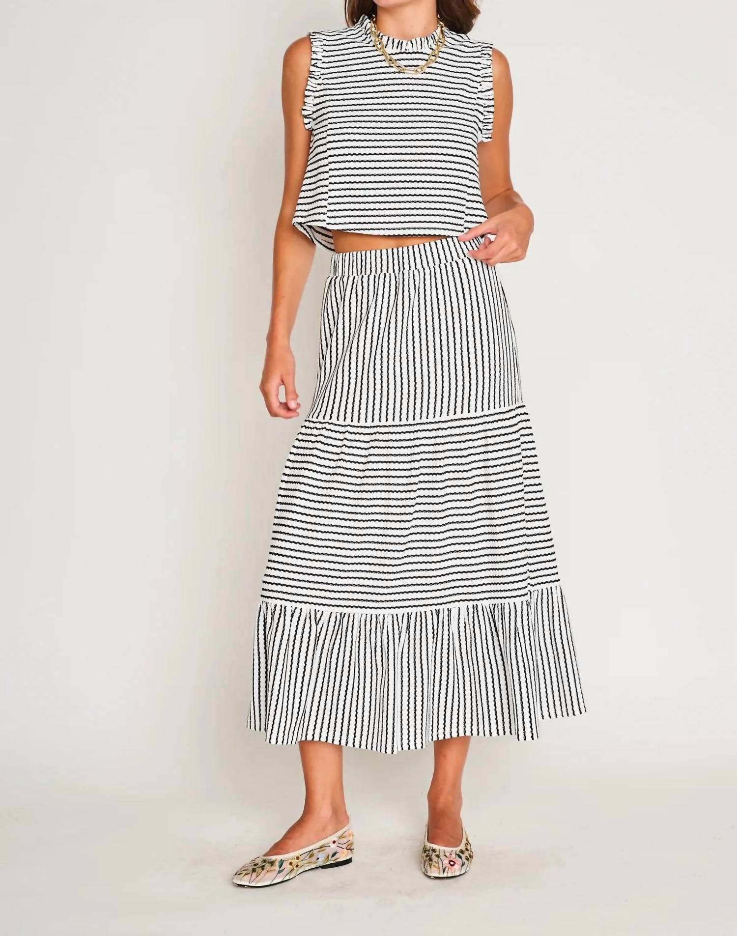 Elevate your casual wardrobe with the Women's Aviana Tank Top by dRA Los Angeles, a striking piece in classic Black/White Stripe. This sleeveless tank is ideal for summer, featuring ruffled band details along the crew neckline and armholes for a touch of boho chic. With its boxy relaxed fit, it pairs effortlessly over denim or with the Maya skirt, perfect for vacation and everyday wear. Made for active, style-savvy women, this top embodies modern elegance without the need for closures.