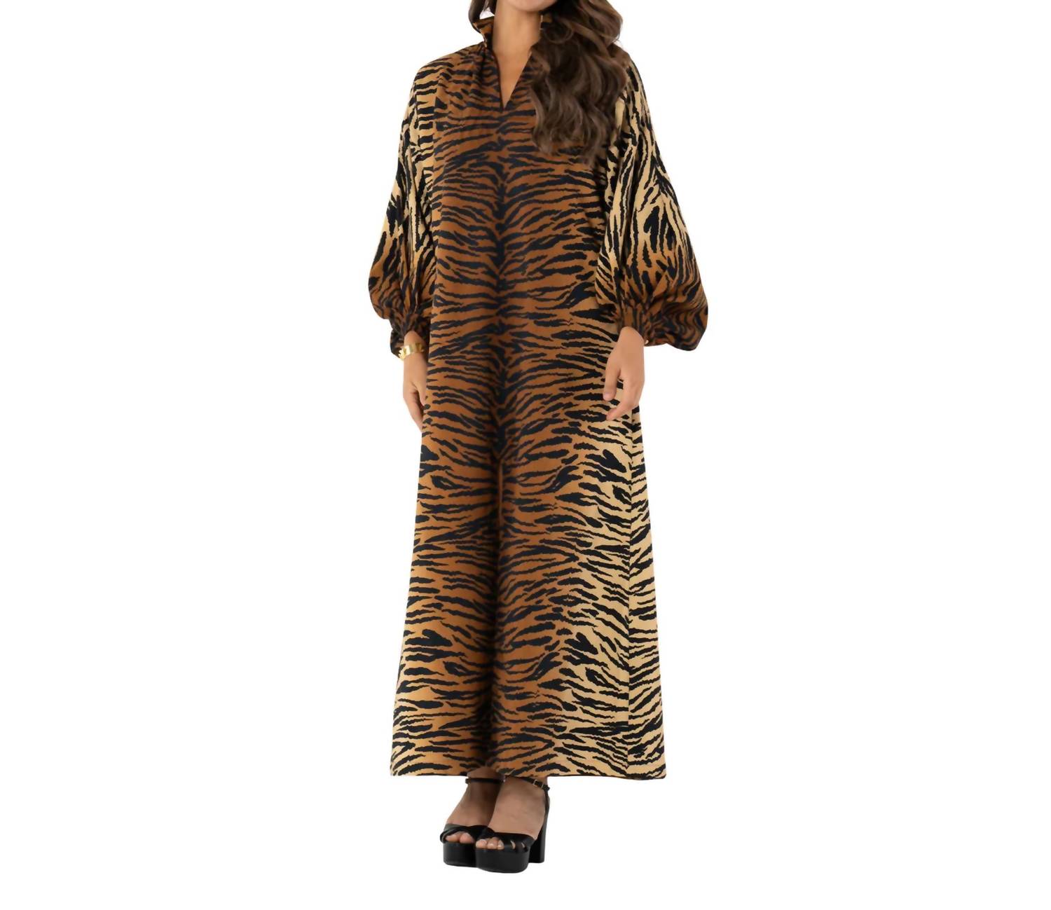 Style this maxi with your favorite statement necklace and sandals for the perfect look. The Fiona Dress in Tiger Jacquard showcases a classic stand collar, dramatic blouson sleeves, and a relaxed, flowing silhouette finished with a front slit. Crafted in a richly textured jacquard, this vintage Italia–inspired print delivers a bold, fierce statement—making it the ultimate showstopper for any event this season.