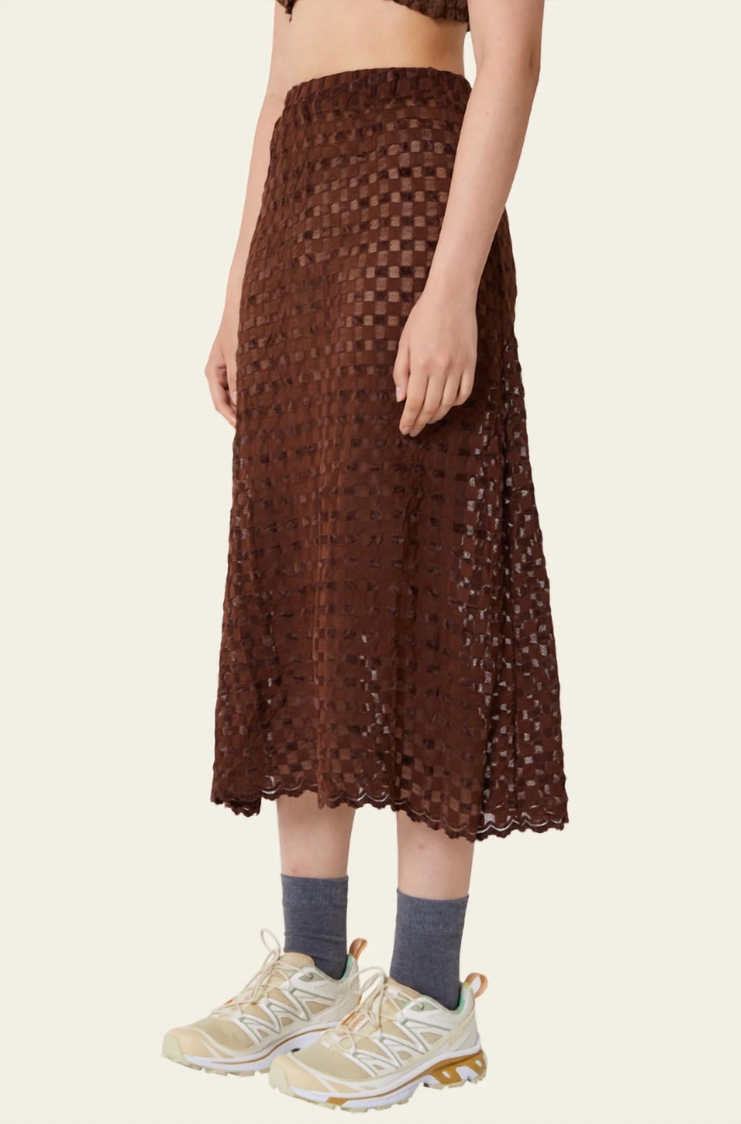 Who doesn't love a good maxi skirt? Introducing the Harmony Maxi Skirt by Find Me Now, a chic choice in a checkboard textured design. This chocolate-hued skirt features a pull-on closure with super stretchy Polyamide, Polyester, and Elastane composition, promising an easy fit. Ethically crafted in China, it's designed to be paired with ease for a minimalist summer beach day look. For care, simply hand wash cold and lay flat to dry. Model is 5'8" and wears a size S.