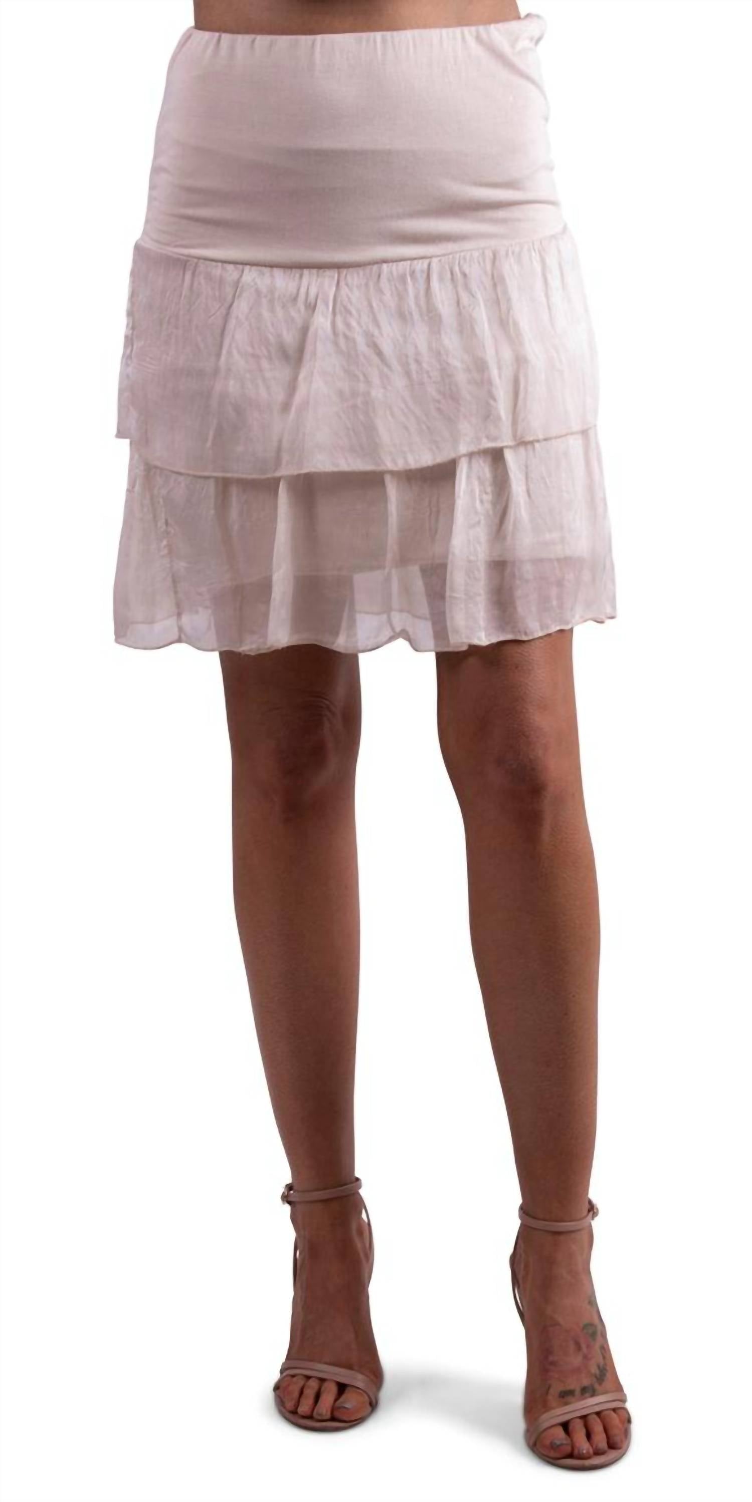 Elevate your summer wardrobe with the Aida Short Tiered Miniskirt by GIGI MODA, a chic cream-colored piece perfect for travel and streetwear looks. This stylish miniskirt is crafted from 100% silk with a knit waistband, featuring a solid pattern and a pull-on closure for effortless wear. The viscose blend lining ensures a comfortable fit with its composition of 95% viscose and 5% elastane. Made in Italy, this skirt is designed as one size fits all and should be hand washed and line dried for best results. Model height: 5'8".