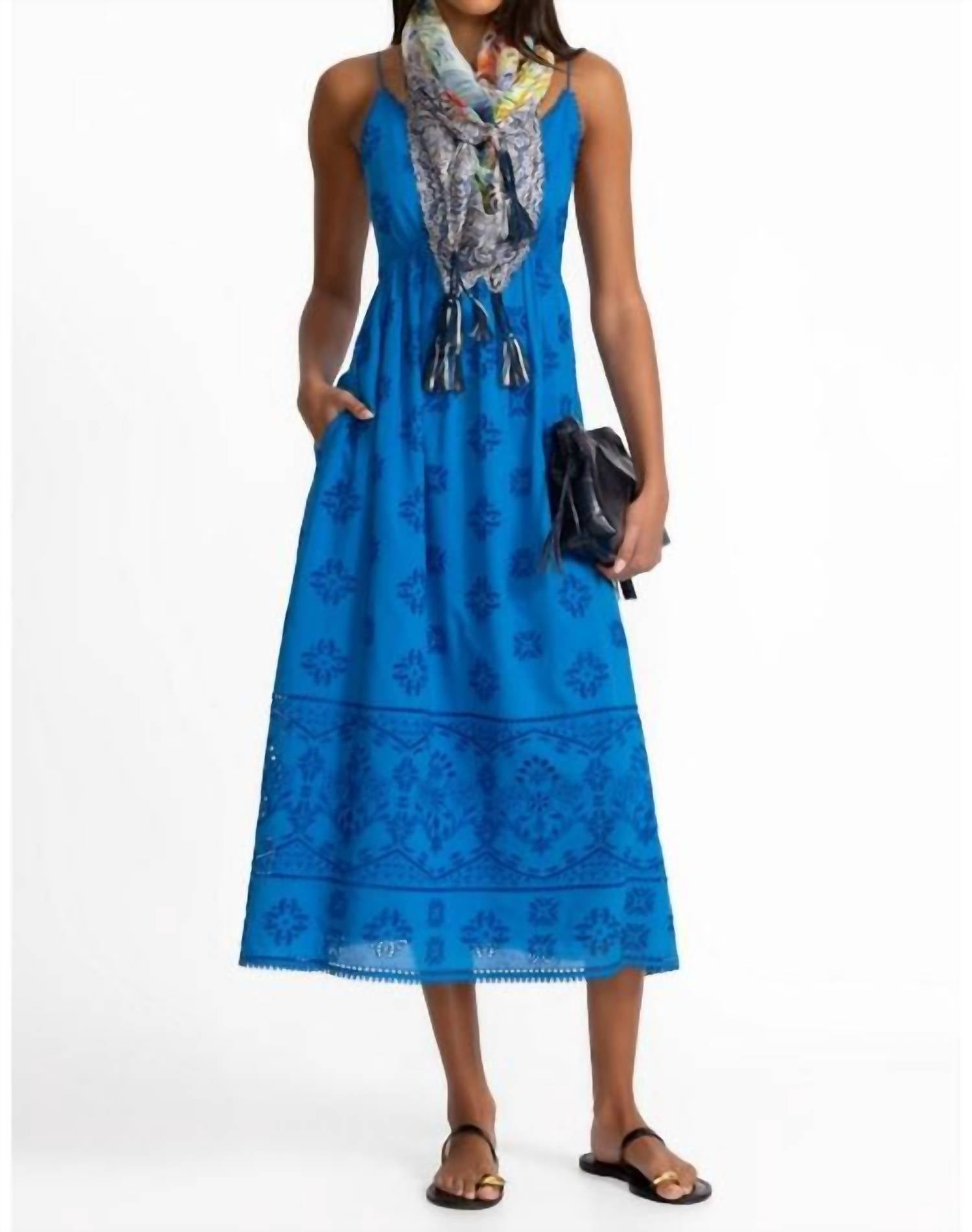 The Cleo Tea Length Dress is crafted from a unique cotton blend and is adorned with rich, tone-on-tone embroidered detailing. Designed with a sweetheart neckline and spaghetti straps, this slip-lined dress features an elasticized back and an empire waist. Hand Wash