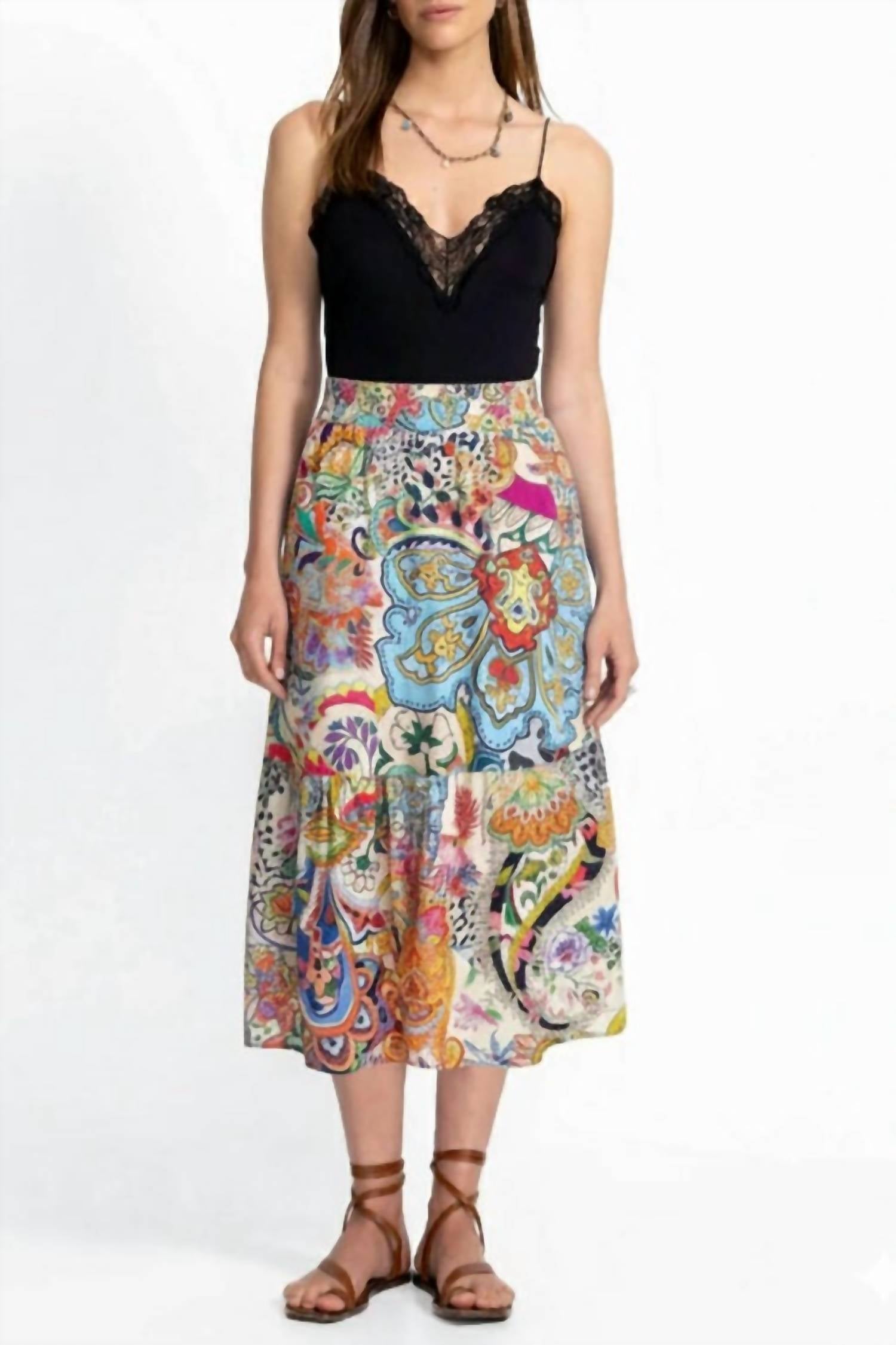 Adorned with vibrant colour and a bold kaleidoscope pattern, the Amanda Janie Fav Single Tiered Skirt from Johnny Was creates a distinctly feminine silhouette. Crafted from Rayon Bamboo with ample stretch, this skirt features an elasticated waist and a flowing tiered midi-length skirt. Machine Wash