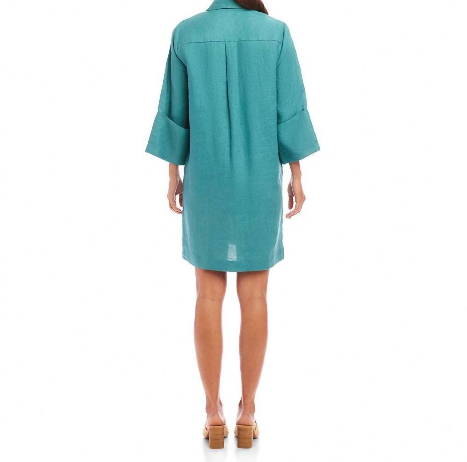 Enhance your closet with the Cuffed Sleeve Linen Dress by Karen Kane, an exquisite piece for minimalist style. This aqua shift dress is crafted from solid linen, featuring three-quarter flare sleeves with wide cuffs and a classic collared neckline. It's made in the USA from imported fabric, with a length of 37 7/8 inches for size M. The dress offers a pullover closure and includes side pockets, making it as functional as it is fashionable. Care instructions recommend dry cleaning only.