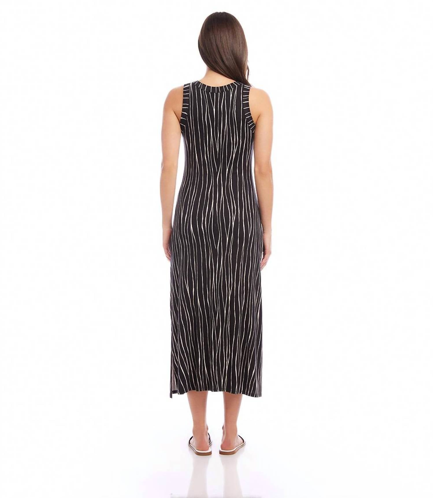 The Sleeveless Midi Dress by Karen Kane is a striking addition to any summer wardrobe with its boho chic appeal. Made in the USA from Italian fabric, this sheath dress features a scoop neck, side slits, and a flattering print of wavy stripes in 95% Rayon and 5% Elastane. Designed with a pull-on closure and no pockets, it fits snugly at the bust and waist, while offering a more relaxed fit at the hips. For care, machine wash separately in cold water on a delicate cycle, avoiding bleach, and hang to dry.