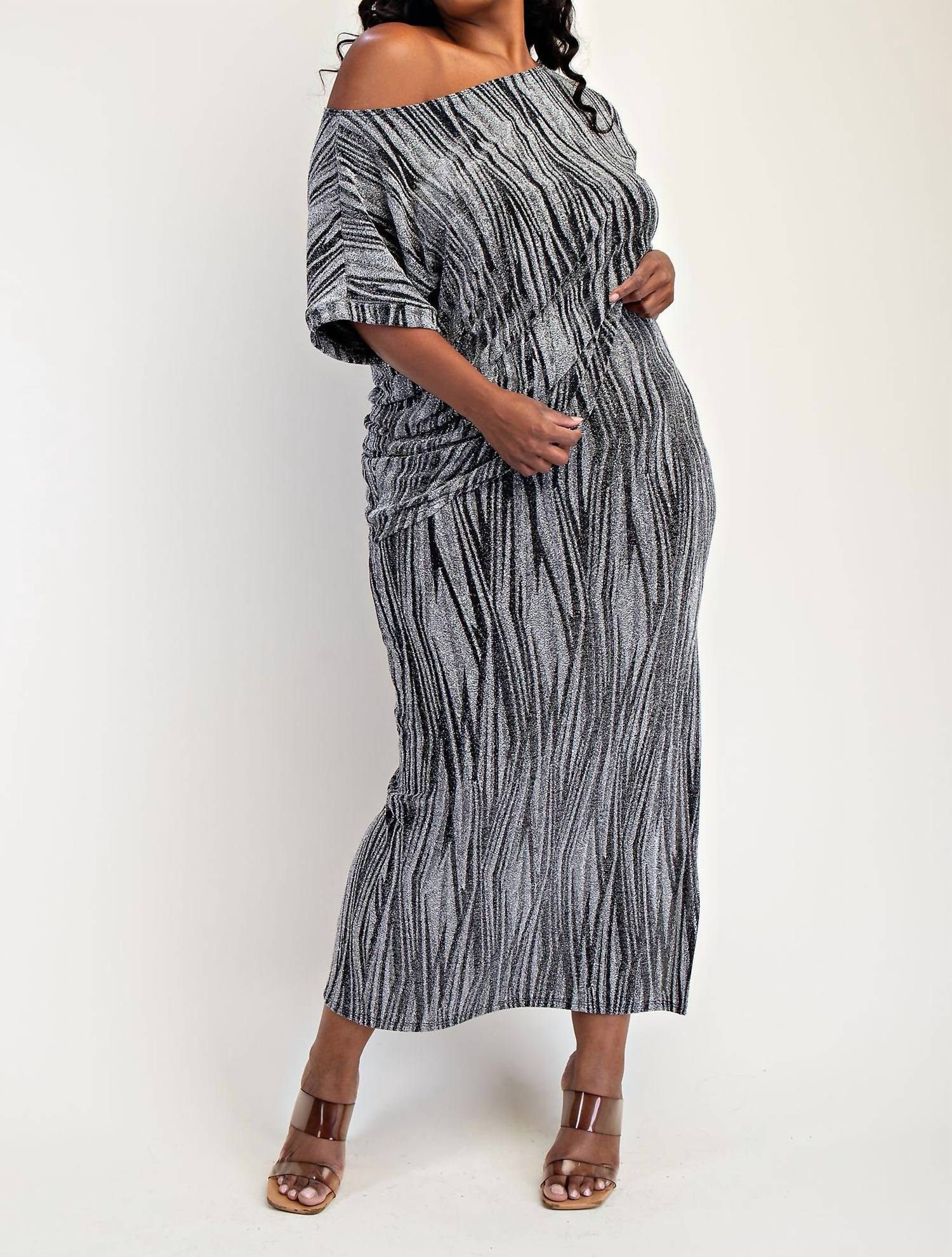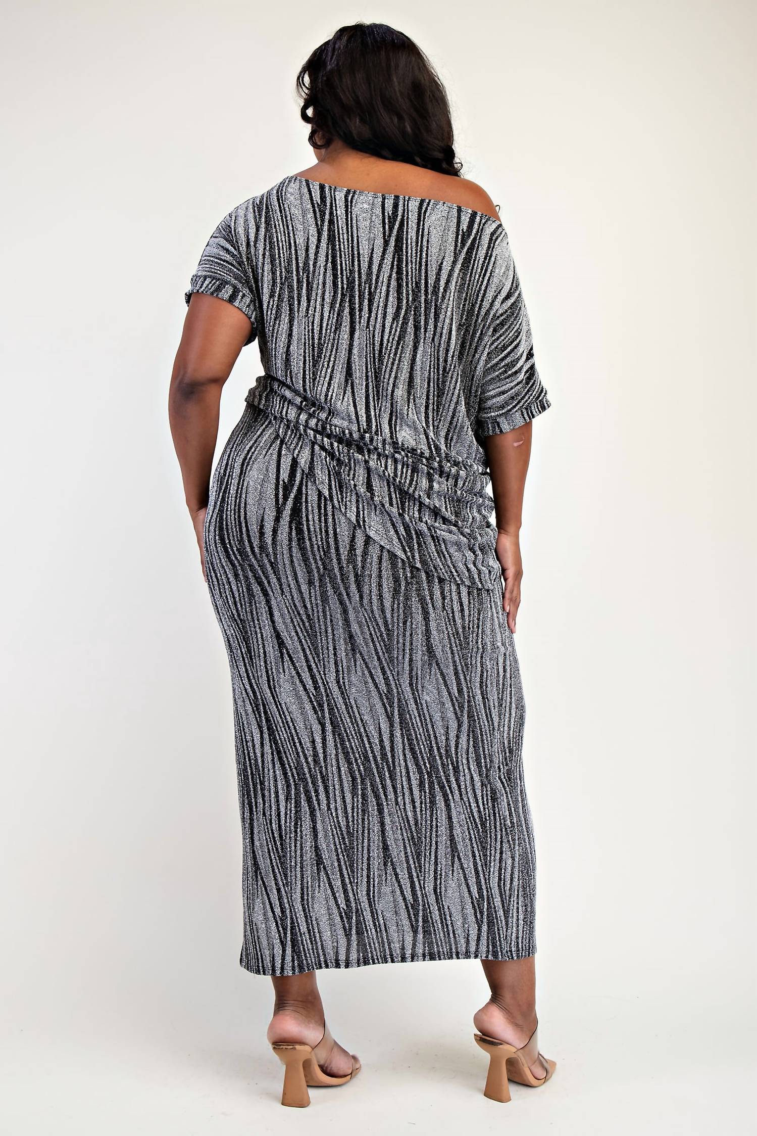 Introducing the Plus Size Lurex Knit Short Sleeve Top and Skirt Set by The Curve LA, a stunning ensemble in silver and black. This matching set features short dolman sleeves and a wide boat neckline on the top, paired with an asymmetrical hem. The matching skirt boasts a high-rise elasticized waist and a side leg slit for a flattering silhouette. Originating from the US, this set offers pull-on closure and is machine washable for easy care.