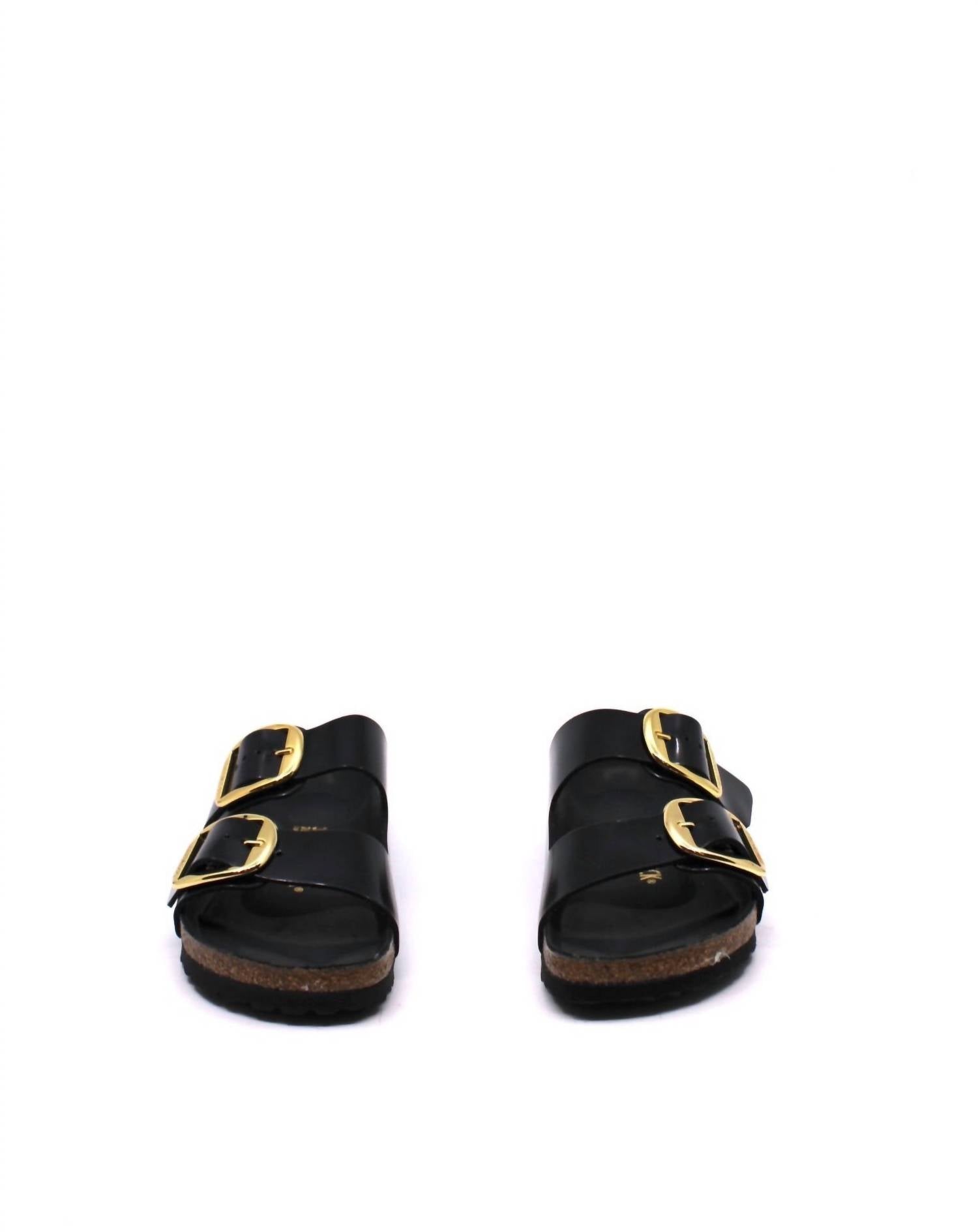 This sandal will take you from brunch to dinner and everything in between. Natural Leather Patent. Two straps, each with a large, individually adjustable metal pin buckle; color-coordinated details. Anatomically shaped cork-latex footbed; semi-exquisite. Upper: natural leather with a high shine finish. Footbed lining: piumato leather. Sole: EVA.Made in Germany