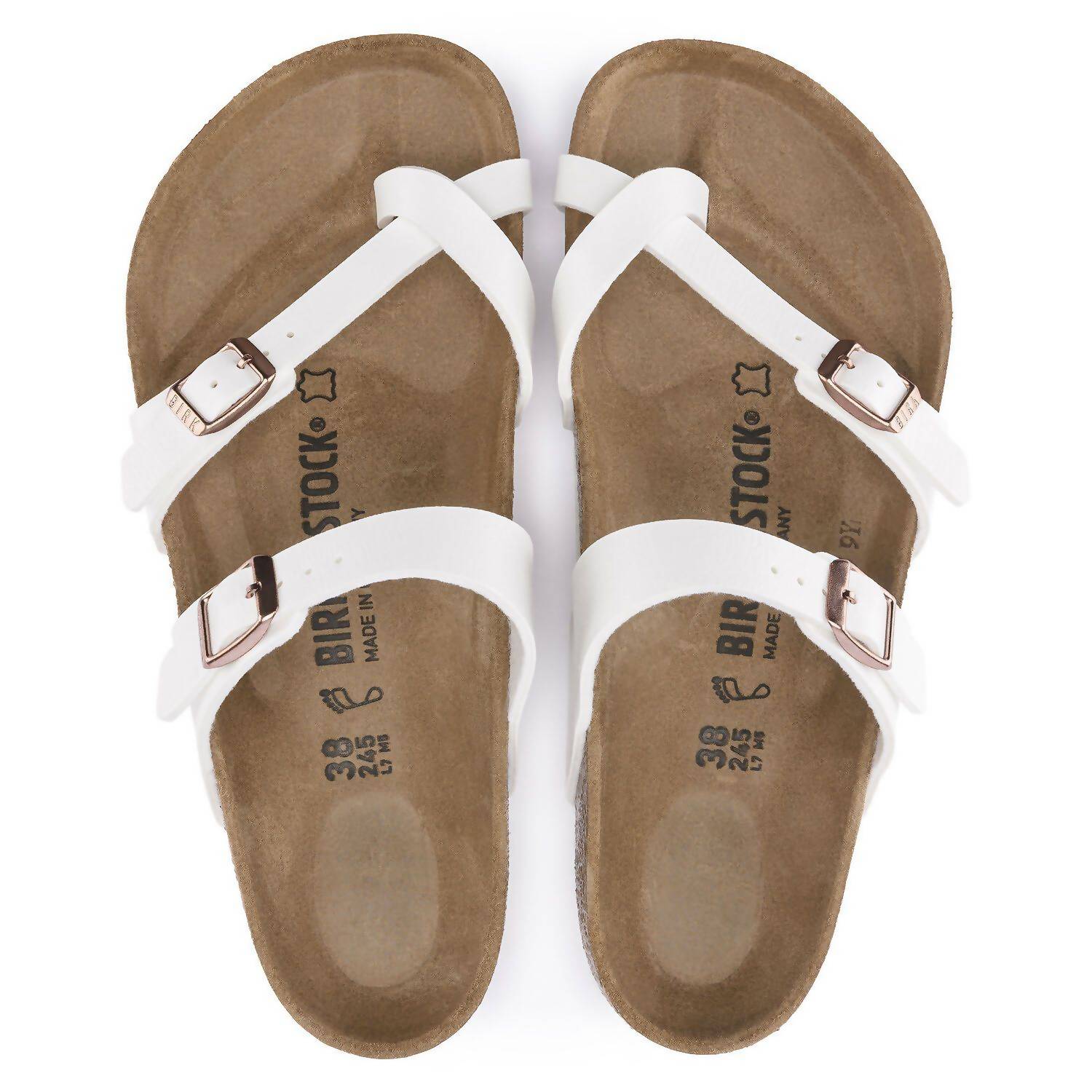 This sandal will take you from brunch to dinner and everything in between. Experience the elegance and comfort of the Women's Mayari Sandal by BIRKENSTOCK, a perfect minimalist choice for a dinner party. This sandal features adjustable crisscrossing straps with a toe loop, finished in White Birko-Flor® with matching outsoles and copper tone buckles for a chic look. Its anatomically formed cork and latex footbed is complemented by a soft suede lining and durable EVA sole. Crafted in Germany, it's the ideal flat-heeled sandal for summer occasions.