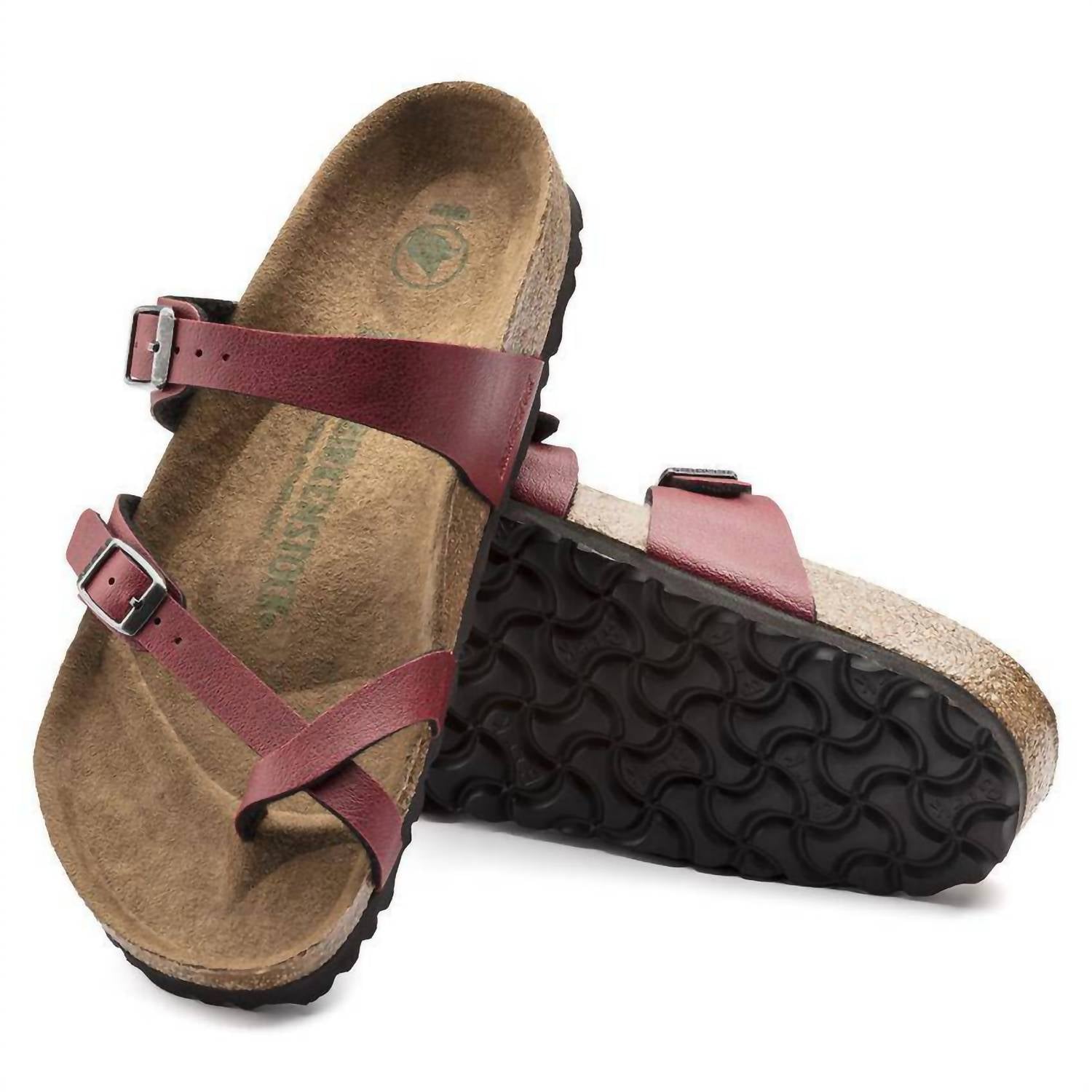 Introducing the Women's Mayari Vegan Pull Up Sandal by BIRKENSTOCK, a chic addition to your summer wardrobe. Crafted in Germany, this sandal features an anatomically shaped cork-latex footbed paired with a microfiber lining for ultimate comfort. The synthetic Birko-Flor® upper mimics the look of real leather while being entirely vegan, verified by independent testing laboratories. With two individually adjustable metal pin buckles and a toe loop, it offers a secure fit, resting on a durable EVA sole. Perfect for a boho chic look at your next dinner party.