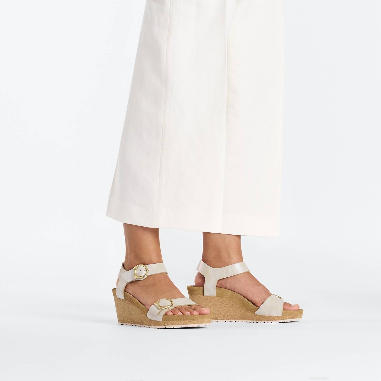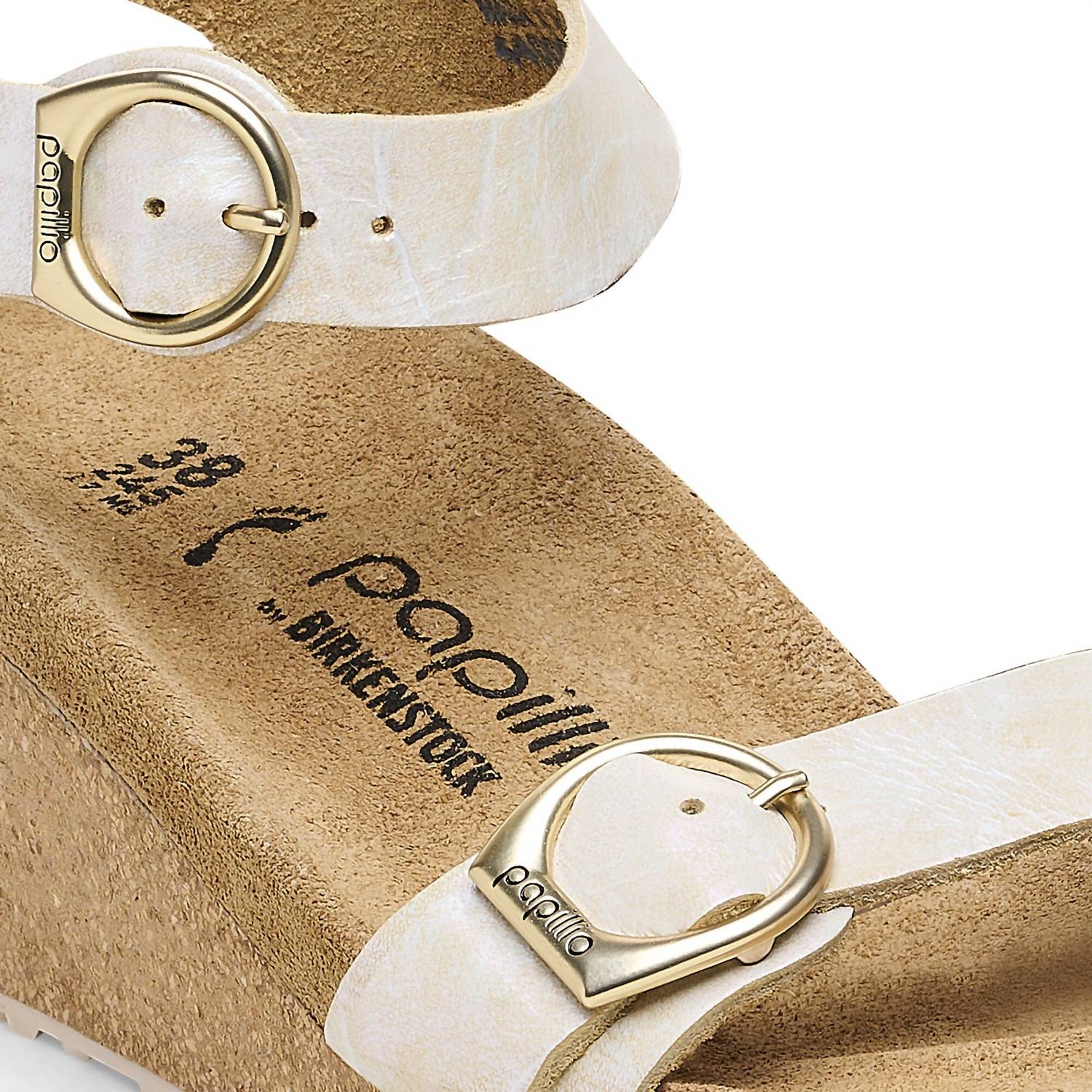 Classicly cute and all-day-wearable. We love this sandal. Step into style with the Soley Ring-buckle Leather Wedge Sandal by BIRKENSTOCK, crafted for those who love both fashion and comfort. Featuring a reflective metallic silver finish, these sandals are made from high-quality nubuck leather, complete with an anatomically shaped cork-latex footbed for supreme comfort. The design includes two adjustable metal pin buckles and a light polyurethane sole, giving a wedge heel height of 40 mm. Made in Portugal, this narrow-fit sandal is perfect for a minimalist summer travel aesthetic.