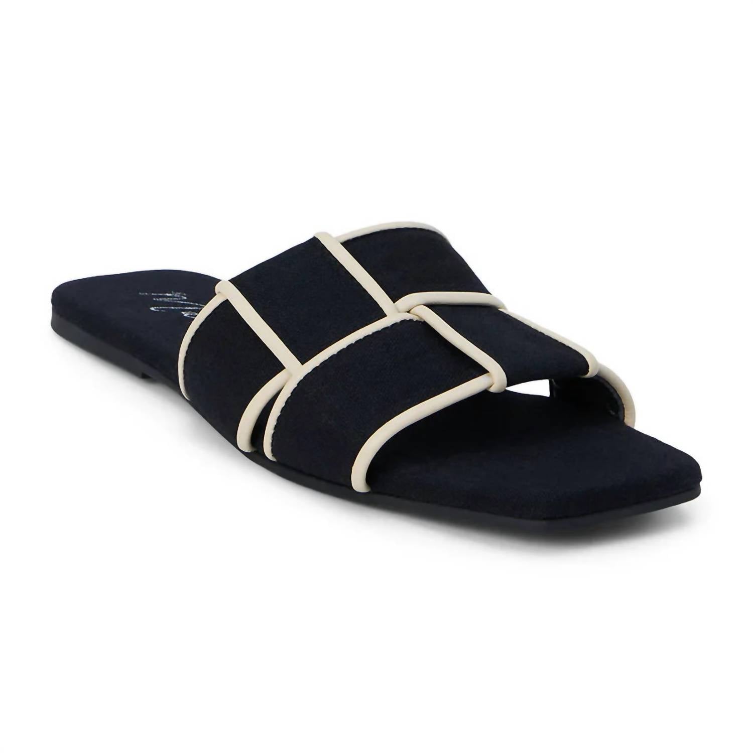 Step into understated elegance with the Women's Biscayne Slide Sandal by Blossom Footwear, crafted for a minimalist and chic summer style. These sandals feature a flat heel and an open toe, with a woven band for added texture. The composition includes a linen and leather upper with a manmade outsole and leather lining, complete with a padded insole for comfort. Slip-on style and imported quality ensure easy wear and a sophisticated finish in classic black.