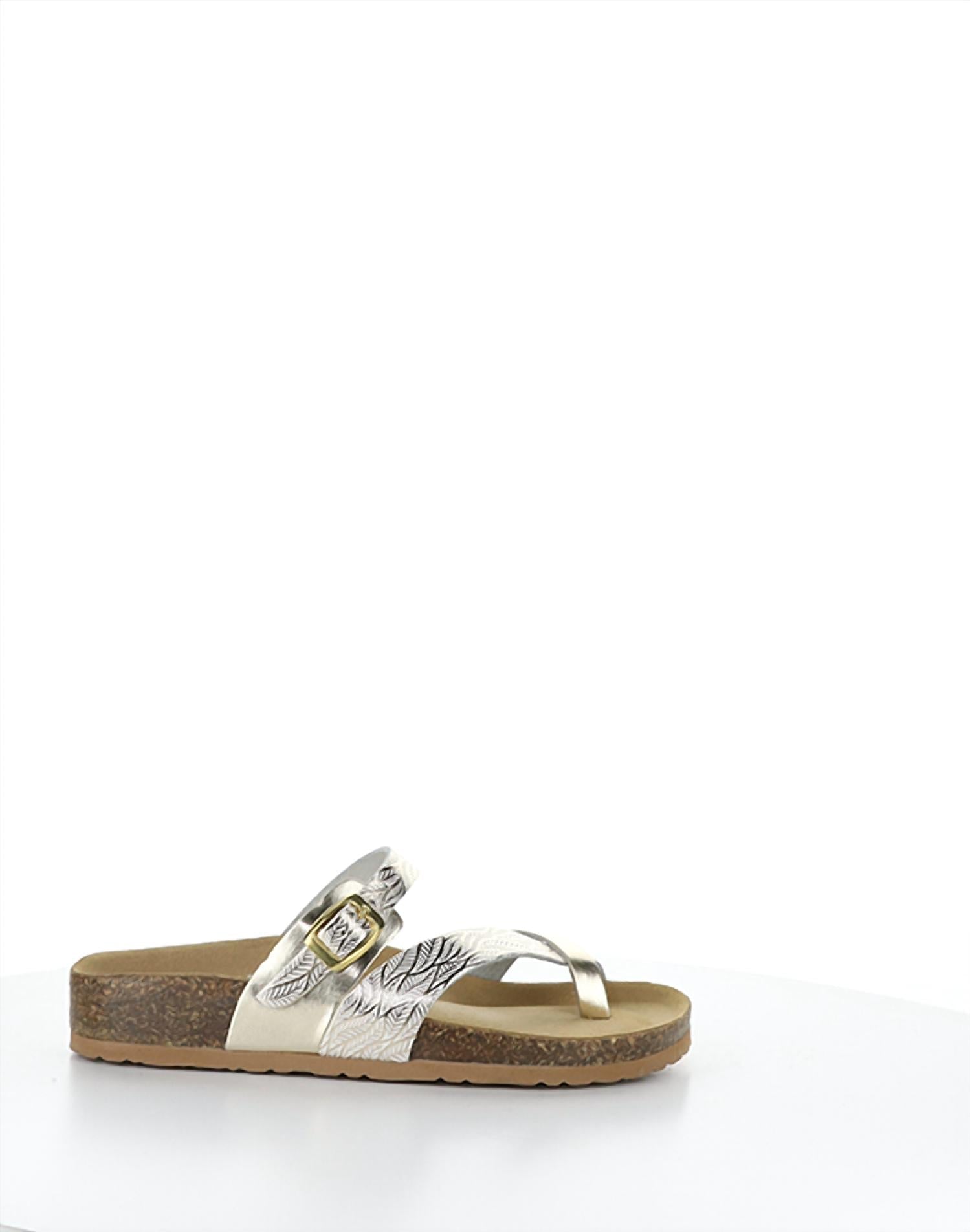 Flowy dresses, cropped pants, and even jumpsuits... this sandal works with them all! Elevate your summer style with the Women's Parr Sandal by Bos. & Co., featuring a sleek White/Gold design. Designed for vacation-ready comfort, this minimalist sandal boasts a leather upper and leather lining, with a low 1.25-inch genuine cork wrapped flex sole. The adjustable buckle strap ensures a perfect fit, complemented by a molded soft cushion insole ideal for long walks. Made in Italy, it's a chic addition to any warm-weather wardrobe.